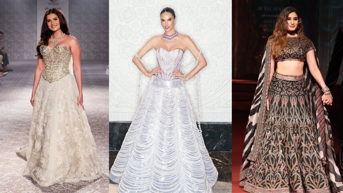 Manish Malhotra’s “party”—more rave than runway—felt like a celebrity photo op dressed up as couture. Victoria’s Secret supermodel Alessandra Ambrosio walked a Plexiglass runway in a pearl-dripping look that sent social media into a meltdown. Just across the hall at the Taj Palace hotel, Malhotra’s retrospective was on view—a shrine to his greatest Bollywood moments, both cinematic and red carpet. It reinforced the same idea: fashion as flashbulb memory, with clothes sometimes secondary to celebrity orbit.