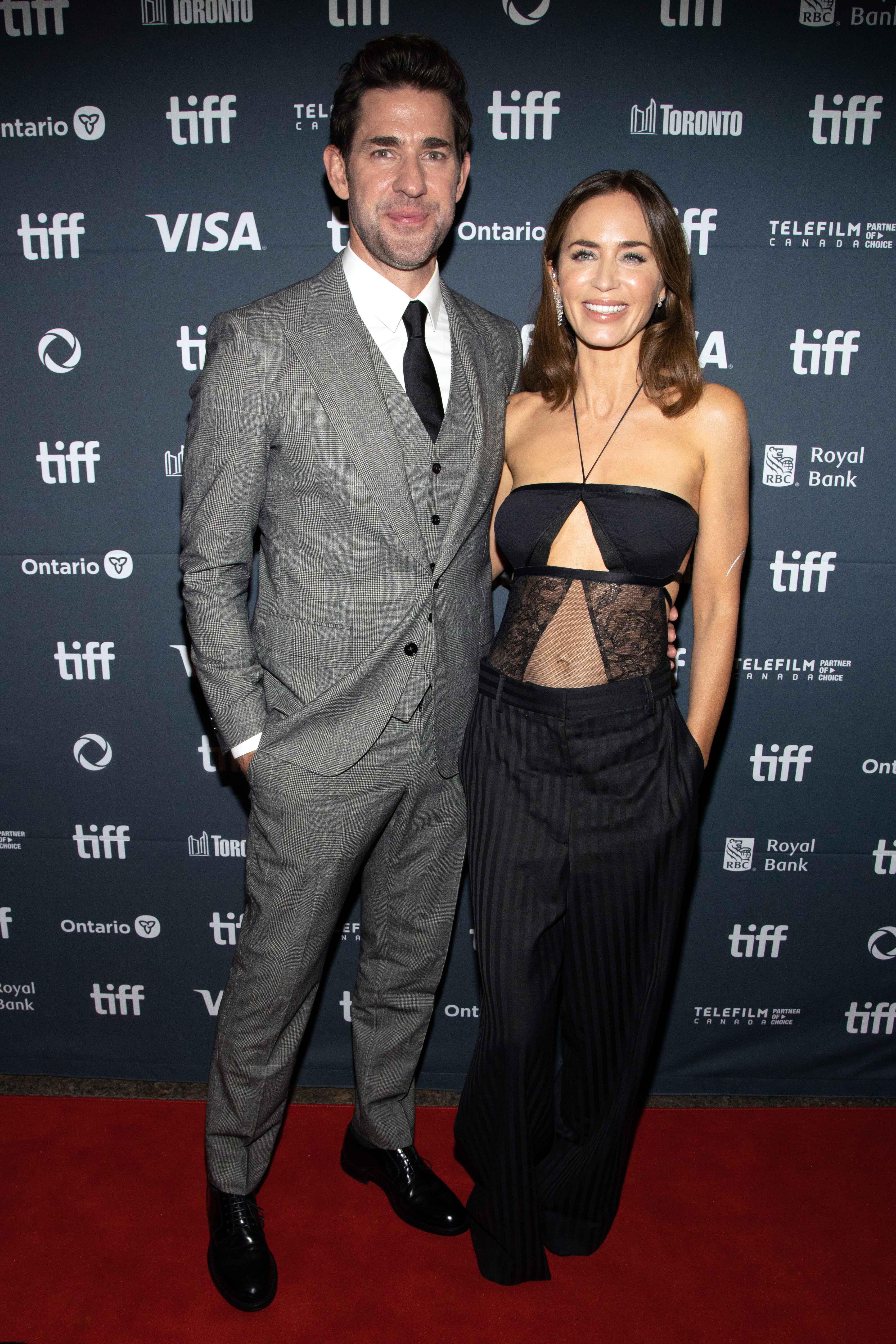 The next day, Krasinski was present at the premiere of his wife's new movie, The Smashing Machine at TIFF 2025. Blunt opted for a risque strapless black ensemble with a sheer lace cutout and low-rise striped trousers, while Krasinski opted for a tailored grey suit and black tie.
