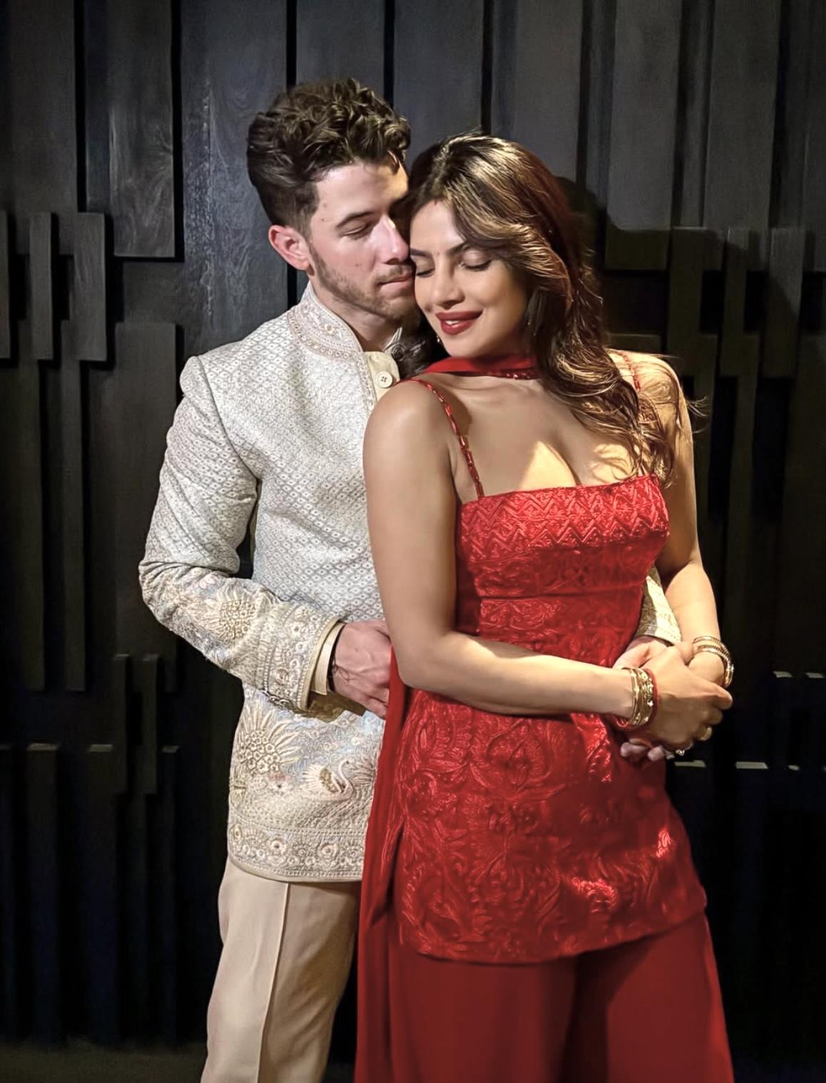 Priyanka Chopra wore a red strap sharara set with an embroidered kurta and narrow dupatta by Manish Malhotra and Nick Jonas picked an ivory embroidered sherwani set by Tarun Tahiliani for their Diwali festivities.