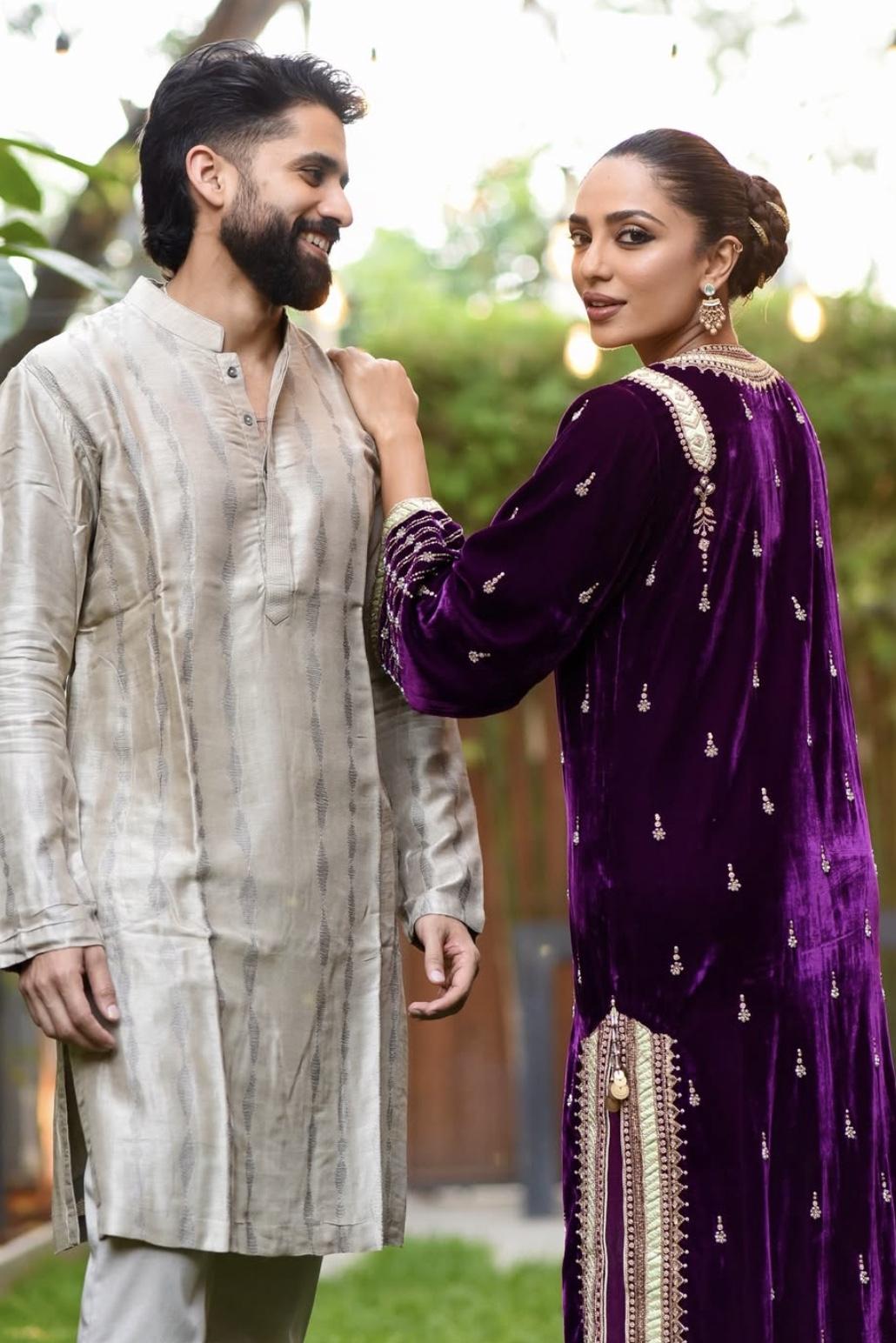 Sobhita Dhulipala wore an oversized purple velvet salwar kameez suit with heavy gold embroidery while Naga Chaitanya paired a patterned beige kurta with straight-leg trousers.