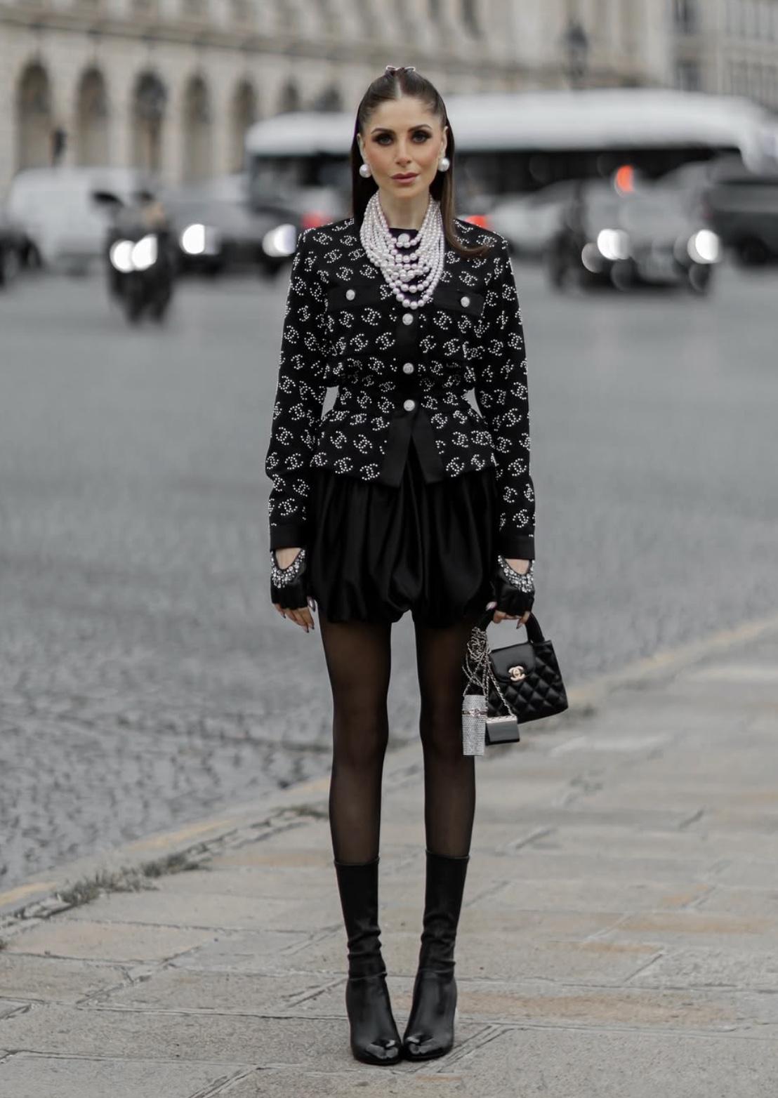 Natasha Poonawalla attended the Chanel showcase, wearing a black dress with an embellished neckline from their Fall 2006 line, which she styled with a pearl body bag, polka dotted stockings and a pearl-heeled Mary-Jane shoes.