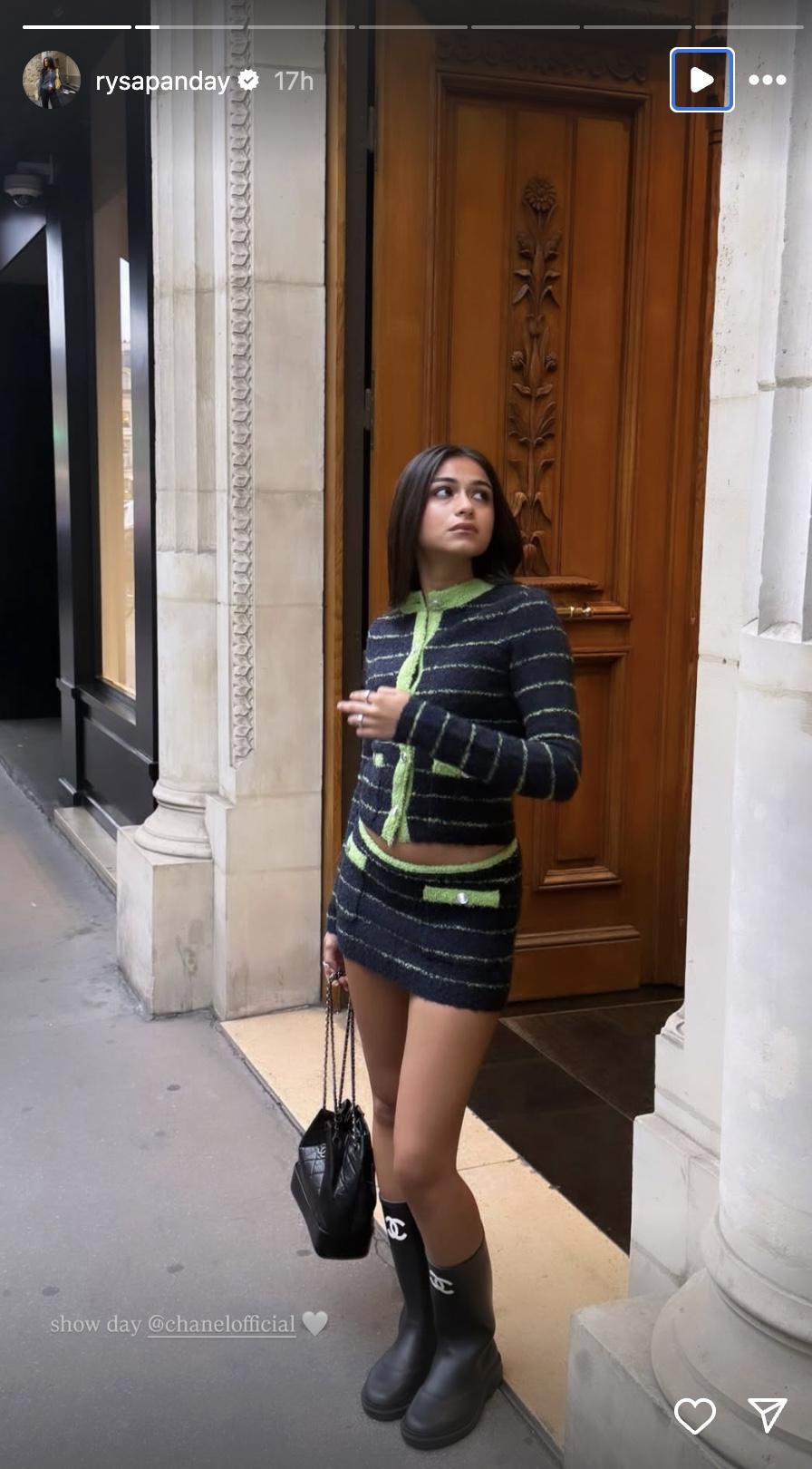 Showing support to her sister Ananya, Rysa Panday also turned up at the Chanel show wearing a striped terry co-ord set, completed with black boots and a quilted bag.