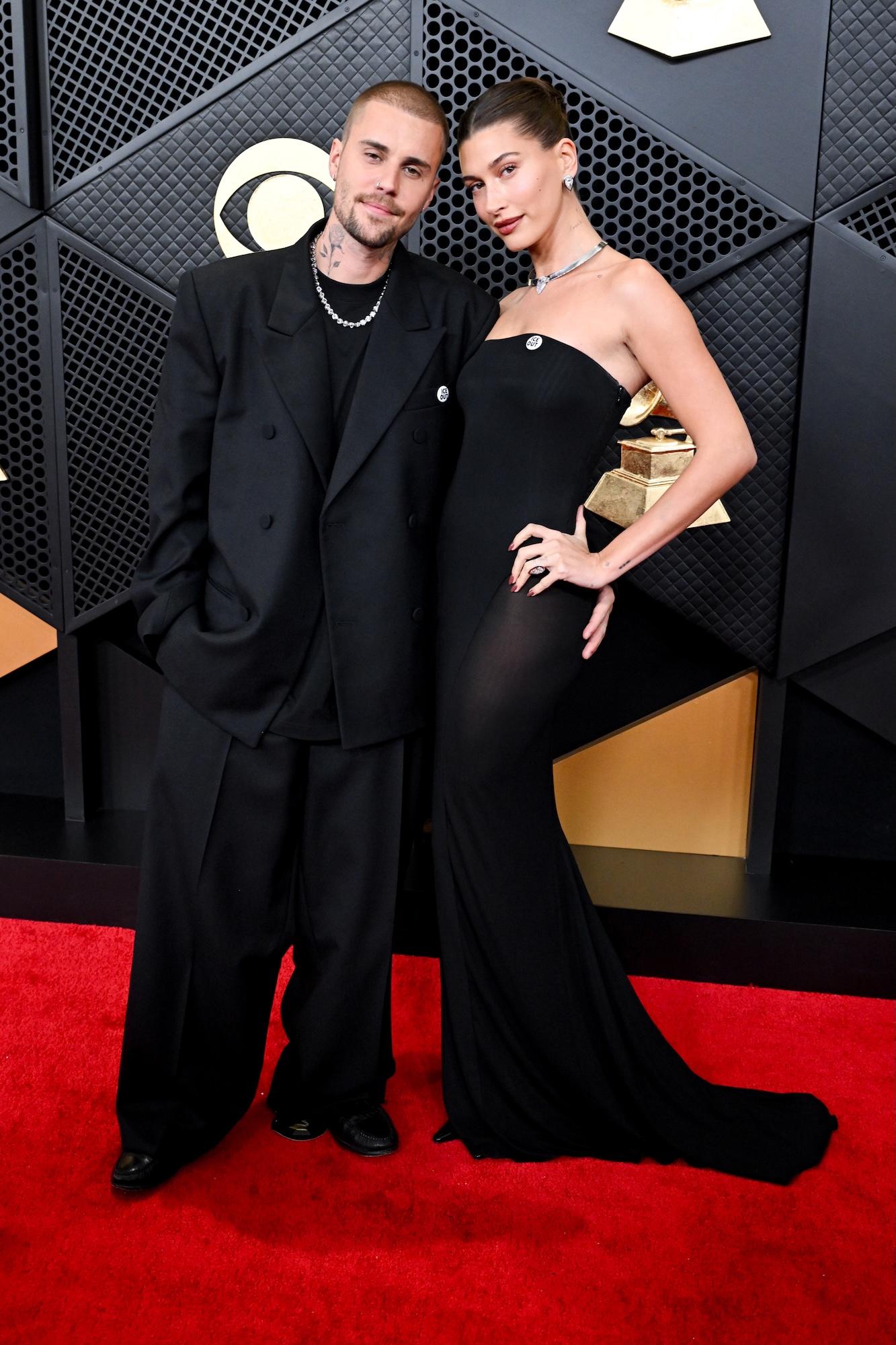 Justin and Hailey made a joint red carpet appearance at the Grammys 2026; their first major red carpet moment in four years. For the awards night, the singer chose an oversized black suit by Balenciaga of a double-breasted blazer and trousers layered over a t-shirt with brogues. A chunky silver chain, nose ring and buzzcut completed his look for the night. In perfect sync with her husband, the Rhode founder kept it minimalistic chic in a strapless black custom Alaïa gown which featured a train and sheer panels over its sides. With her hair in an updo, Hailey too wore a silver necklace and earrings while the married couple both sported 'Ice Out' pins with their outfits. The event marked their return to the limelight; with their last joint red carpet outing at the Grammys in 2022.