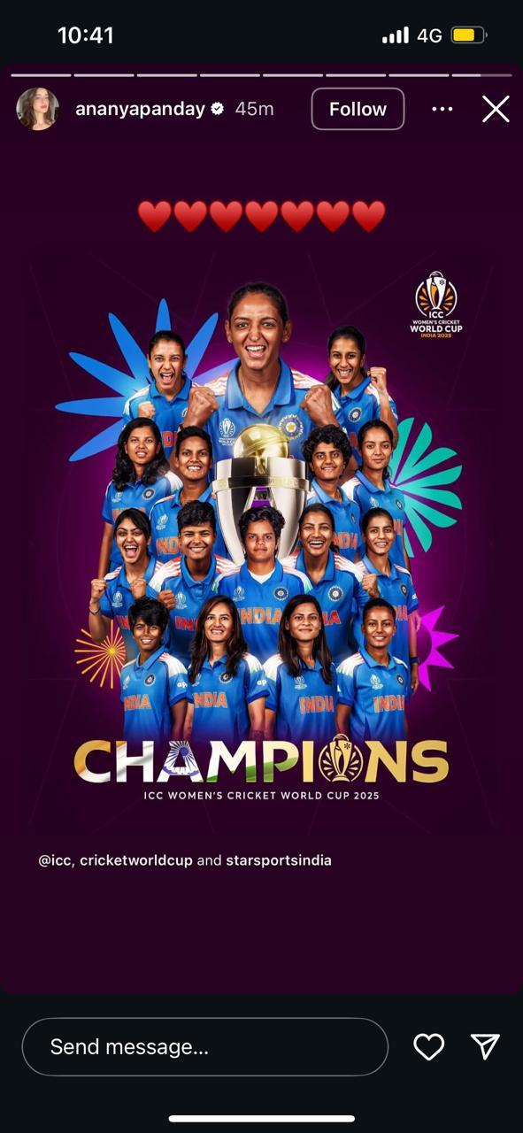 It wasn't just Bollywood's biggies, though, who shared their support and appreciation. Although former Indian skipper Rohit Sharma was present in flesh to watch the match, in the name of the game, India's very own men in blue, both former and present, took to their own social media handles to give these power women the love they deserved. Who better than them to know the feeling, right? A moment of pride, the feeling was shared by Virat Kohli, Sachin Tendulkar, who was present at the stadium too, Yuvraj Singh, Shubman Gill and Abhishek Sharma.