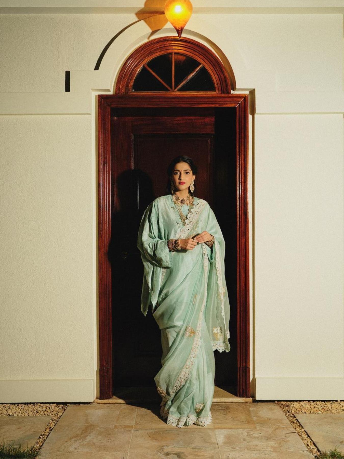 Sonam Kapoor attended a wedding in Abu Dhabi wearing a glorious green saree by Anamika Khanna which feature white lace trimming and a long sleeve saree blouse which she paired with gold jewellery, dayes before she revealed her second pregnancy.