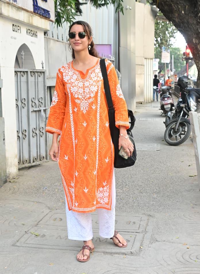 Triptii Dimri nailed the ethnic chic look when she was spotted attending her dance class in Mumbai while wearing an orange chikankari embroidered kurta with white palazzo pants and brown kolhapuri sandals on her feet.