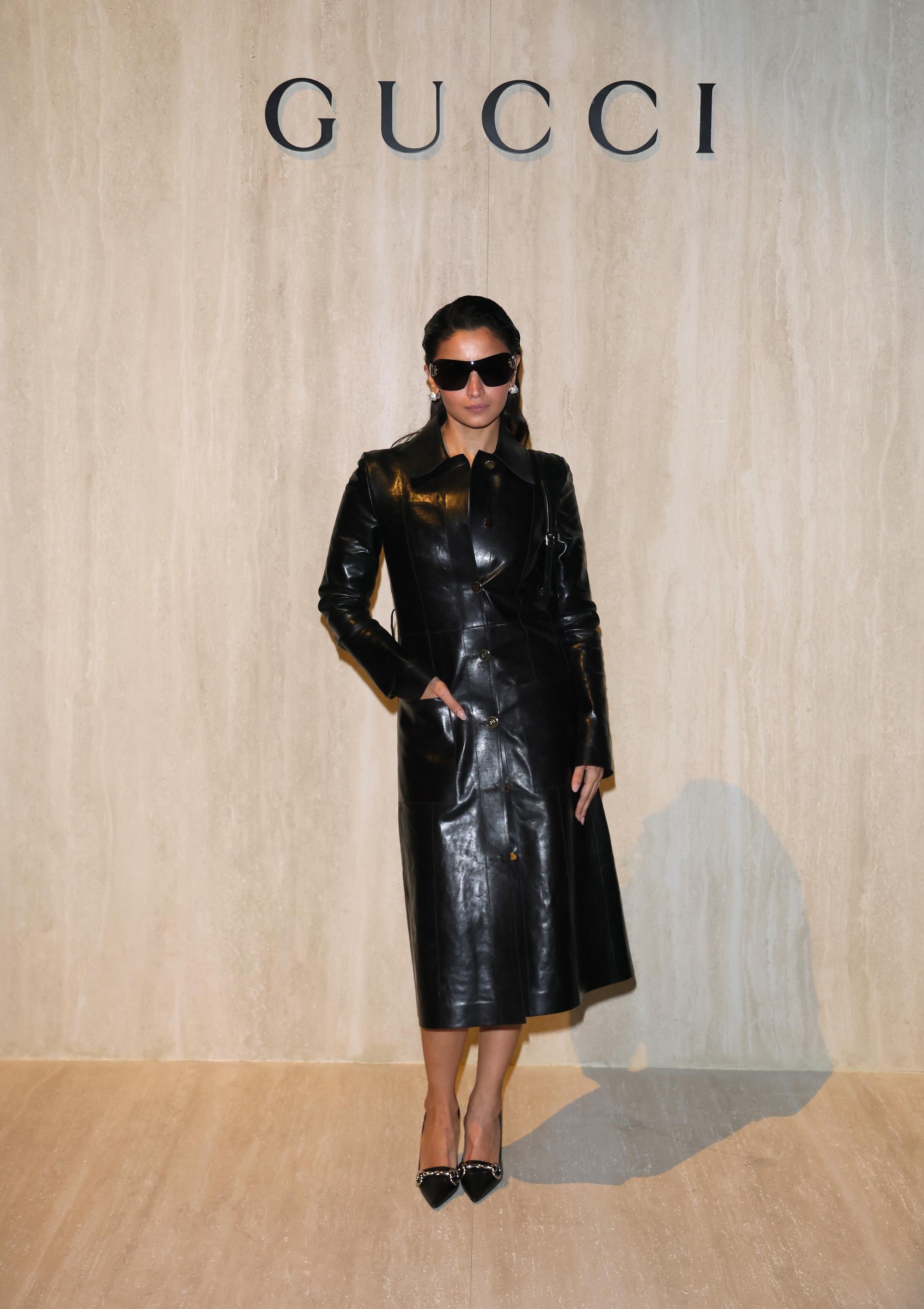 Alia Bhatt, India's first global brand ambassador for Gucci, was snapped attending the Gucci show at Milan Fashion Week wearing a black leather trench dress with pointed pumps and oversized sunglasses with slicked back hair.