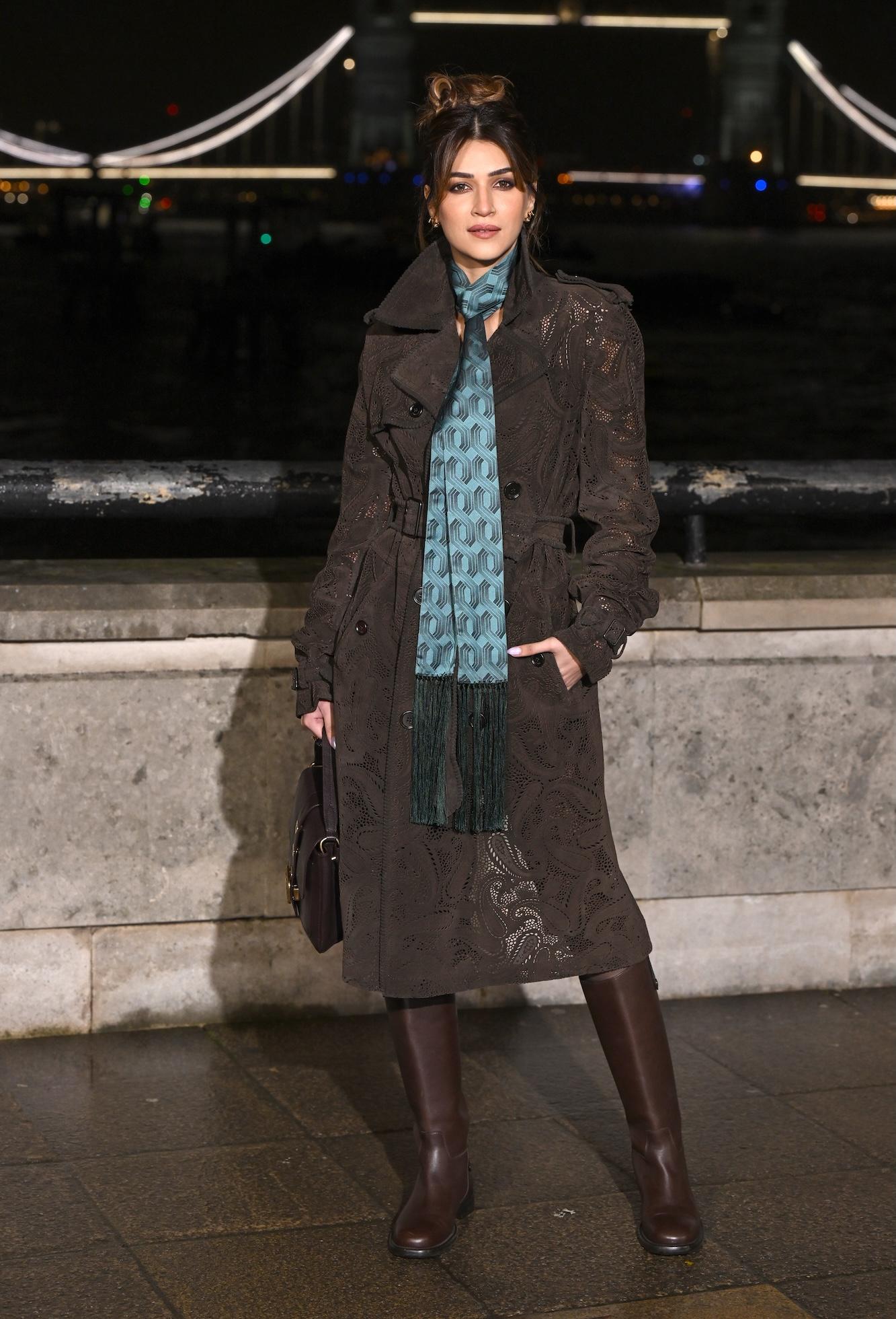 Kriti Sanon attended the Burberry showcase at London Fashion Week wearing a brown cutwork trench dress with a teal patterned stole around her neck and knee-high brown boots.