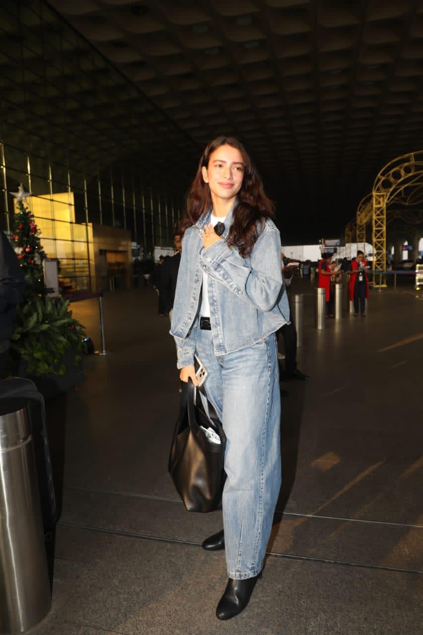 Denim on denim will never overrated. At the airport, the same holds true. Triptii Dimri went the light-washed denim route matched with black leather accessories to mark the beginning of the new year in style.