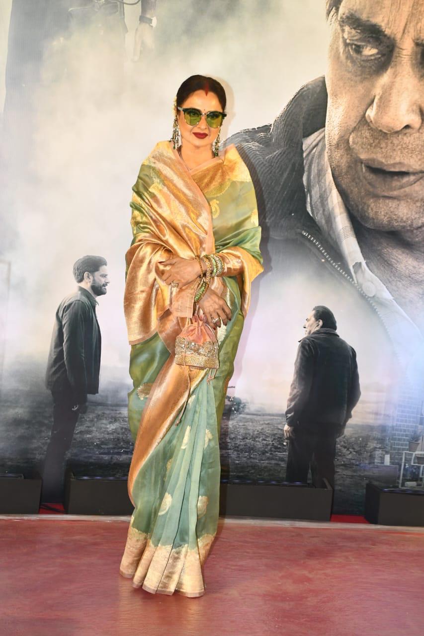 Veteran star Rekha too was seen at the premiere in her stunning saree style, per usual. She wore a sage green Banarasi tissue saree, accompanied by matching green sunglasses and her signature red pout.
