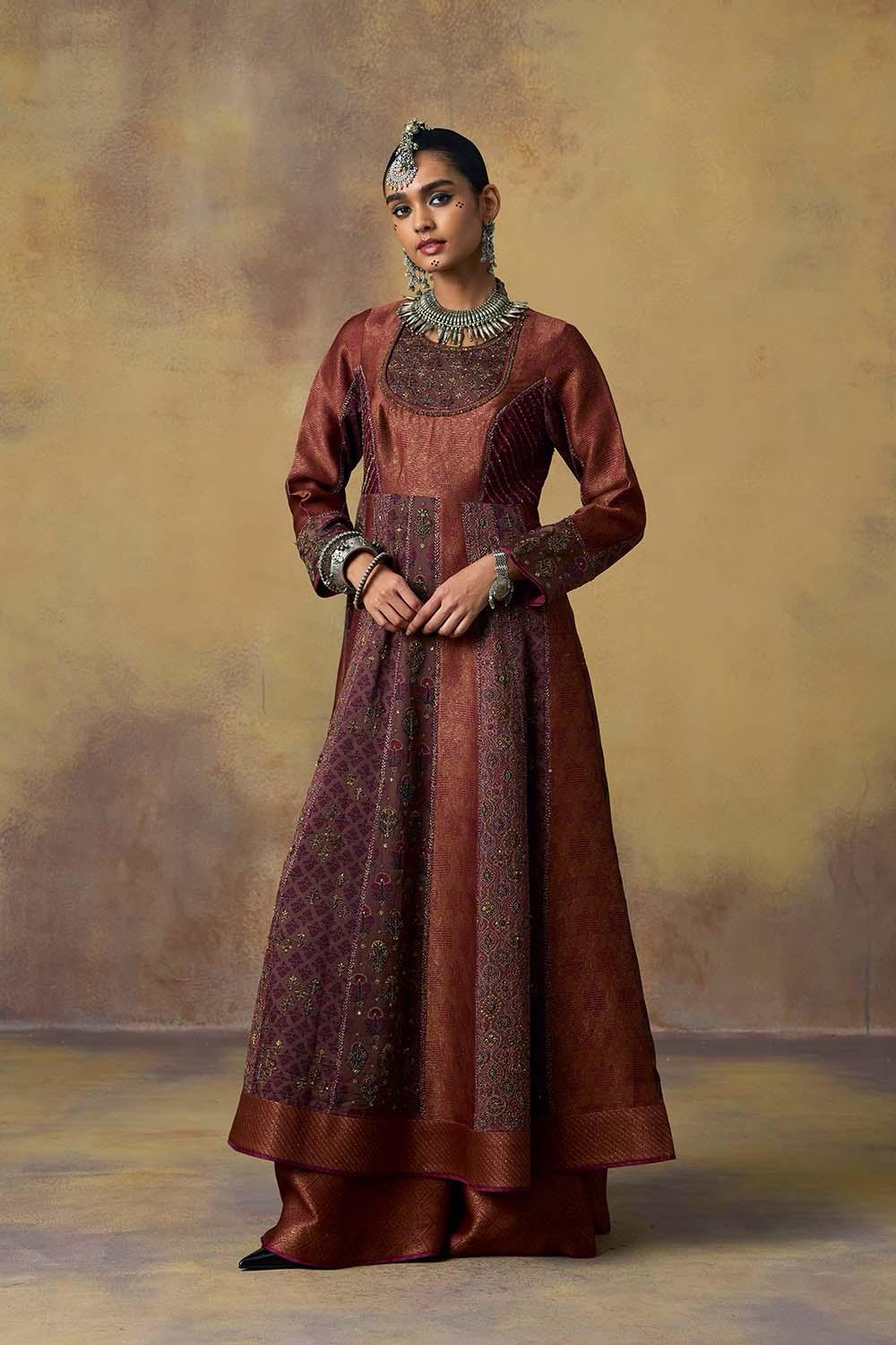 Deep wine hues take centre stage in richly woven ensembles layered with heirloom-style dupattas and antique gold accents. Styled with statement jhumkas and softly pulled-back hair, the look feels timeless yet effortless—ideal for an intimate Lohri gathering where elegance speaks quietly but confidently.
