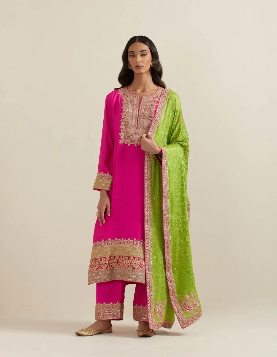 Outfit: Nidhi Tholia, Fuschia Kurta Set with Green Bandhani Dupatta, Rs. 1,03,300