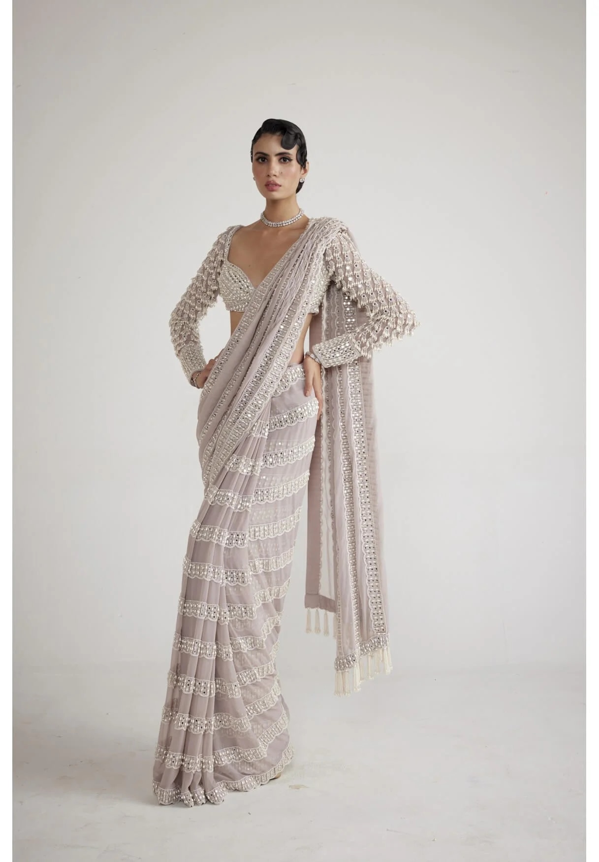 1. Ash Pink Chandelier Pearl Drop Saree Set for Rs 119,500