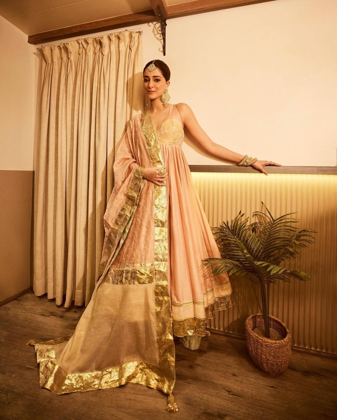 Ananya Panday exudes grace in a soft peach anarkali paired with a gold-bordered dupatta. She elevates the traditional look with statement chaandbalis, a maang tikka, and stacked bangles, keeping the vibe regal yet effortlessly elegant.