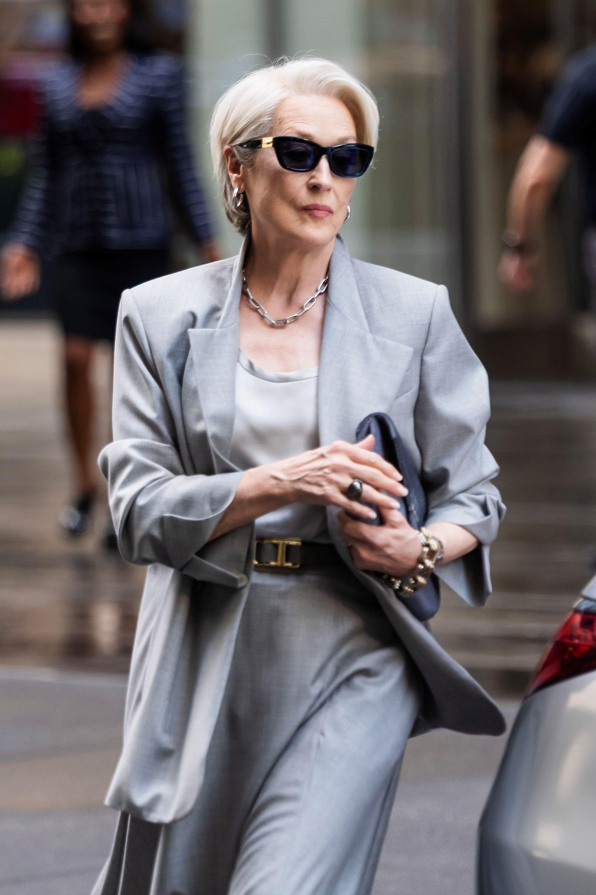 In one scene set in Milan, Meryl’s character wears an Armani Privé jewelled evening duster jacket. Another striking look is a red gown created by the Balenciaga designer Pierpaolo Piccioli, which she sports during a Met Gala-inspired scene. “Right off the bat, Meryl and I and everybody in my department said: ‘Whatever you’re doing on that red carpet, it’s red. Don’t even look at cerulean, don’t match your hair – the devil wears red.’