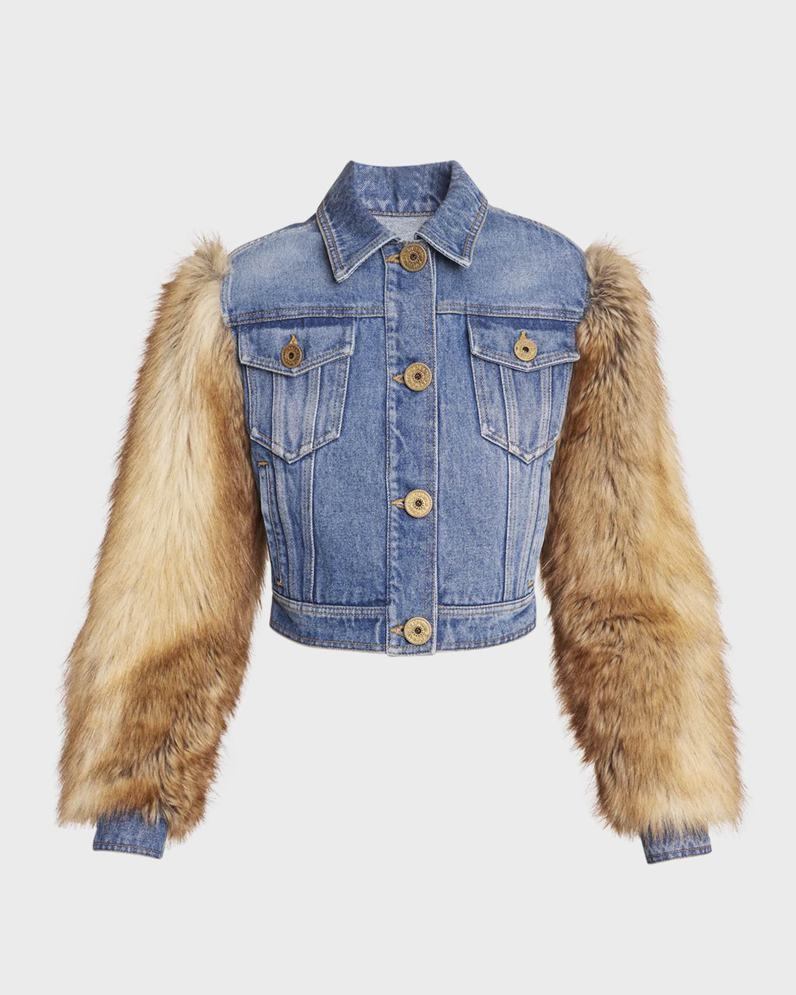 Jacket: Balmain, Faux Fur-Sleeves Denim Cropped Jacket, Rs. 68,200 approx.