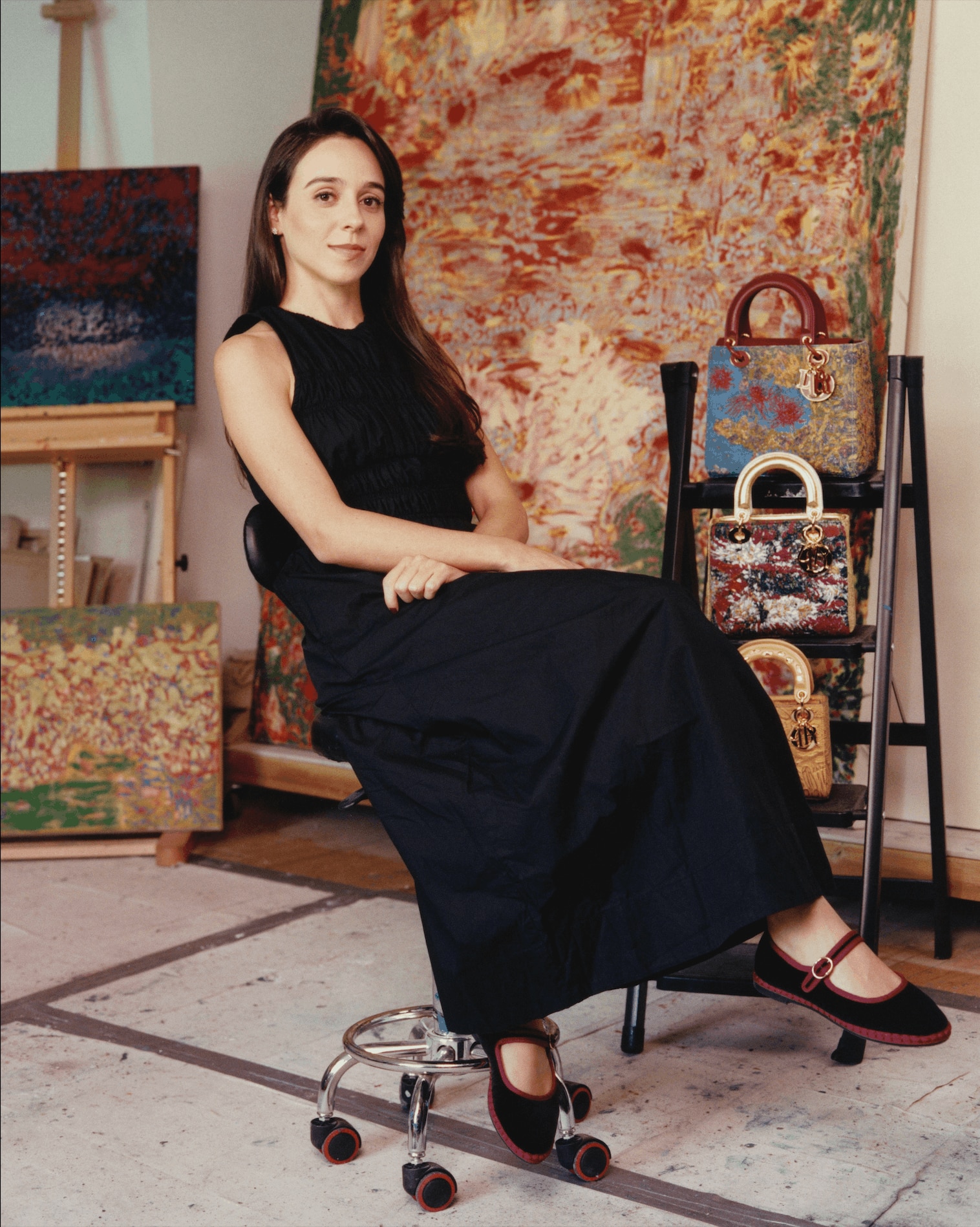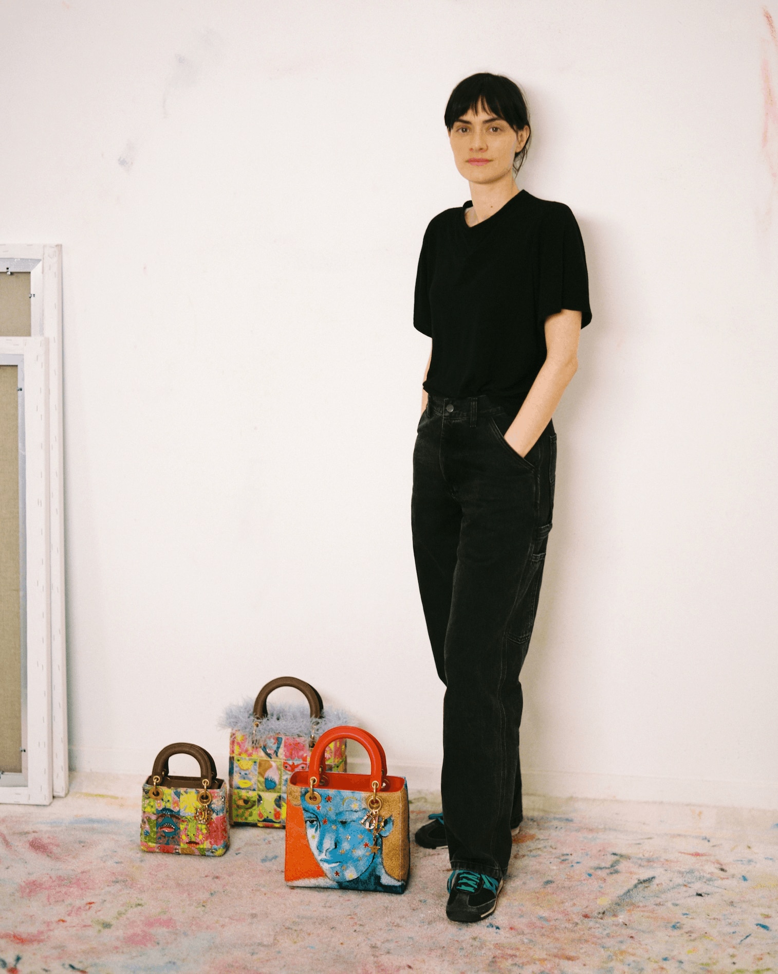 INÈS LONGEVIAL: Inès Longevial brings her chromatic portraits — faces treated as landscapes of light and shadow — into three Lady Dior variations. Her bags incorporate multidirectional embroidery, patchwork, miniaturised canvases and a crown of ostrich feathers. Inside, a starry sky lining and celestial motifs honour Monsieur Dior’s lucky star. What distinguishes Inès’ approach is how the Lady Dior becomes an extension of her painted surfaces, translating brushstrokes and emotion into thread, texture and tactility.