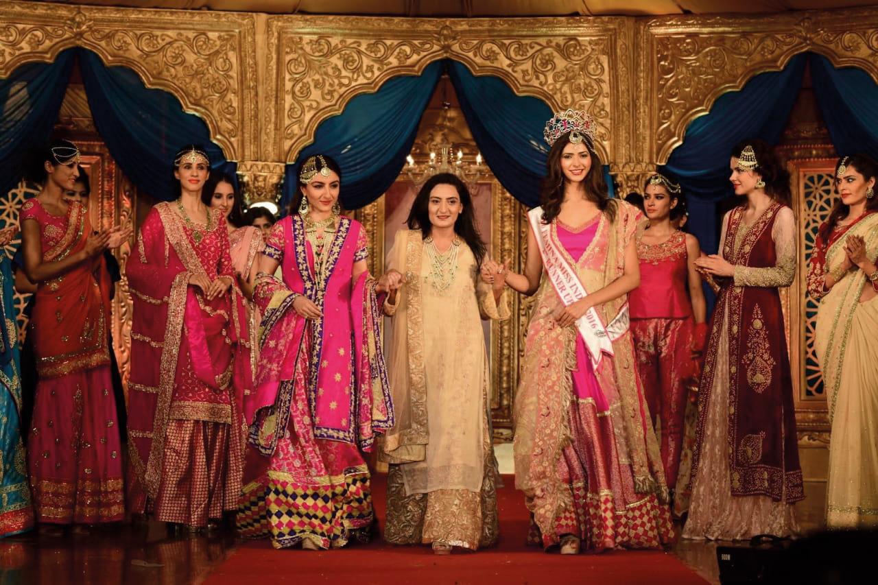 She shows off a pink tissue gharara paired with a brocade kurta. The mukaish work on the skirt is delicate yet delightful, infusing the ensemble with quite a scintillating aura. “Ghararas, their accompanying shalukas or kurtas and dupattas became the canvas for showcasing the most exquisite embroideries reflective of Awadhi craftsmanship,” Asma emphasises. “At our atelier, we’ve retained this vocabulary of vintage allure and refinement. It’s a legacy of Awadhi costume, culture and craftsmanship that we are steadfastly carrying forward by reviving heirloom designs, forgotten yet glorious silhouettes, authentic zari brocades and fine embroideries.”