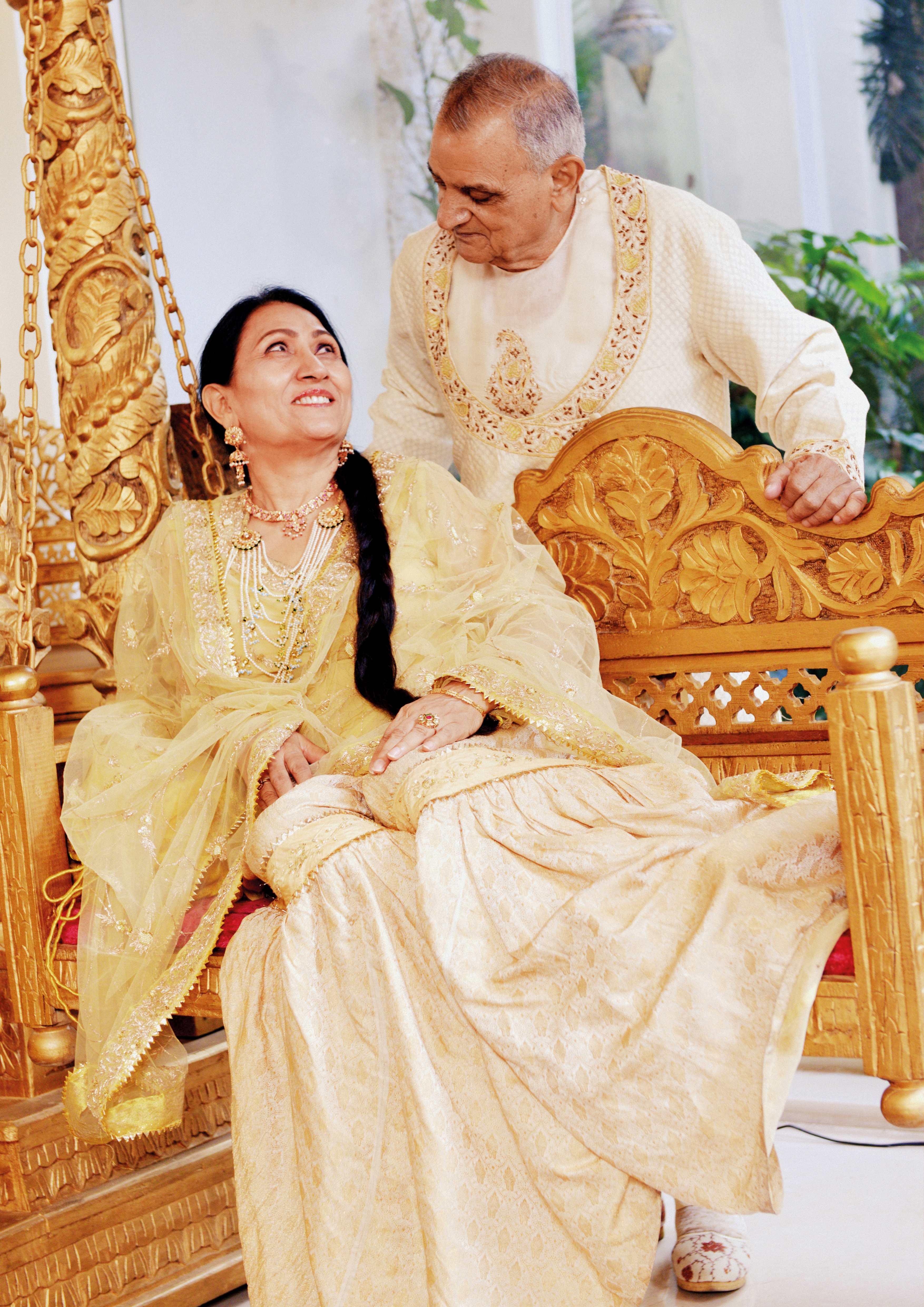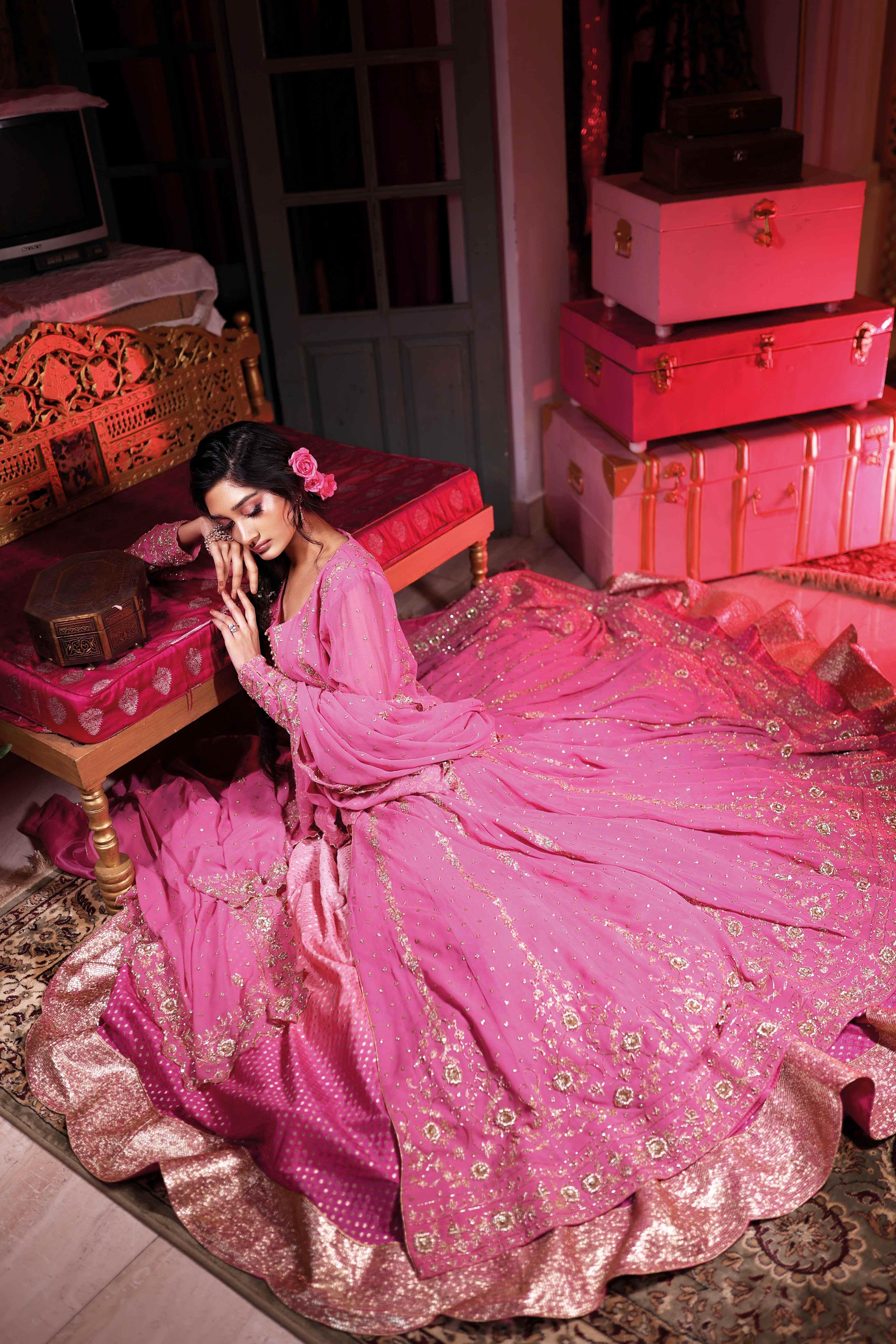 “This Farsi pyjama is what you see as the gharara with a trail today,” Asma says. “One side of the skirt would be slightly lifted and tucked at the waist, presenting a unique silhouette for the feminine form. To complete the look, a stunning dupatta of almost three metres would be stylishly draped over both.”