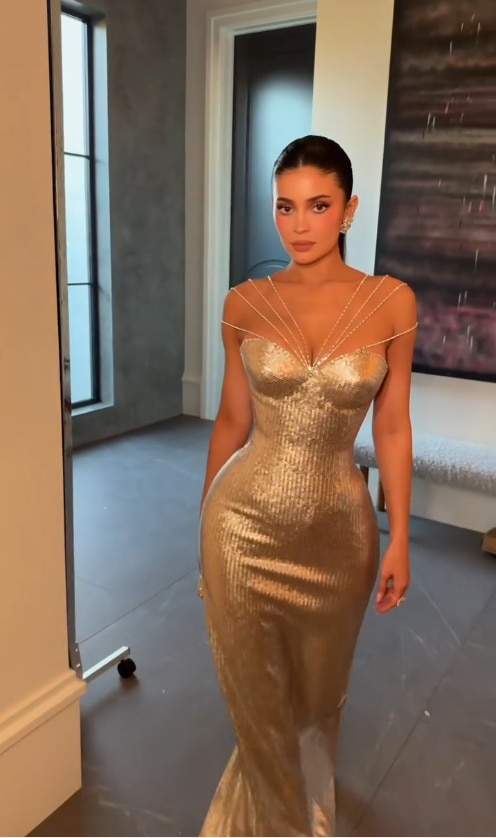 She shared an Instagram Reel where she was seen in a metallic gown that grazes her physique to the T. The custom gown by Ashi Studio had everything Kylie Jenner is known for and loves: a gown that hugs her body like it was sewn on her, a sweetheart neckline that makes accessorising a lot more glamorous, and a sheen that reflects with every movement. The gown begins with a sweetheart corset at the top, embellished with a rhinestone neckline that disguises itself as a statement neckpiece and then follows along to a floor-sweeping mermaid gown, combining form and texture. In case there wasn't enough gold, she paired her outfit with an equally bright gold clutch. Although the neckline doubles up as jewellery, Kylie Jenner added some more with her statement stud earrings.