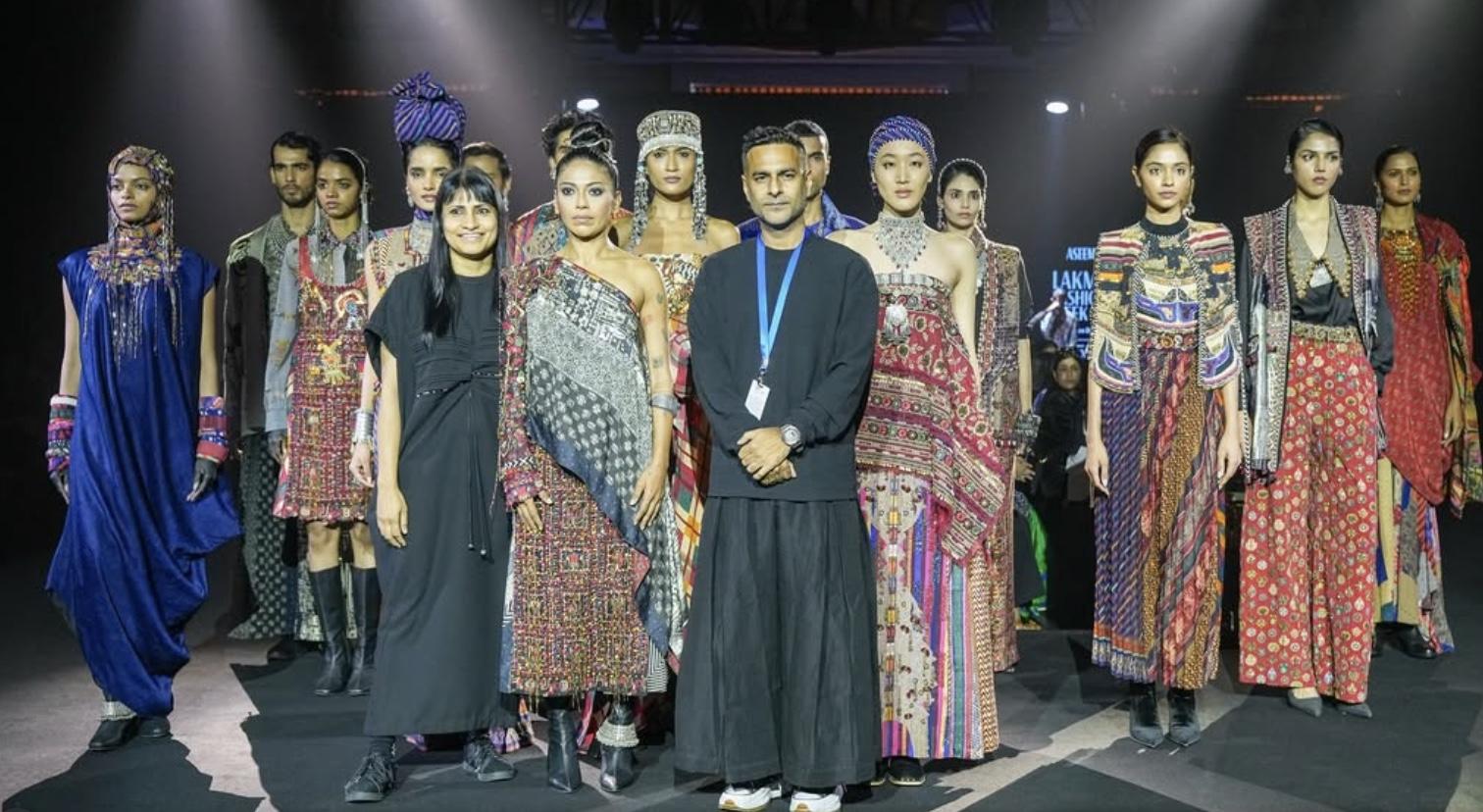 Aseem Kapoor’s collection Akaar at Lakmé Fashion Week x FDCI drew inspiration from the ancient Nazca Lines of Peru, translating their mystical geometry into intricate textile art. Featuring motifs like spirals, hands, and hummingbirds, the collection celebrated sacred symbolism through contemporary design. The show opened with actor Anasuya Sengupta, who set the tone in a striking one-shoulder embellished ensemble.