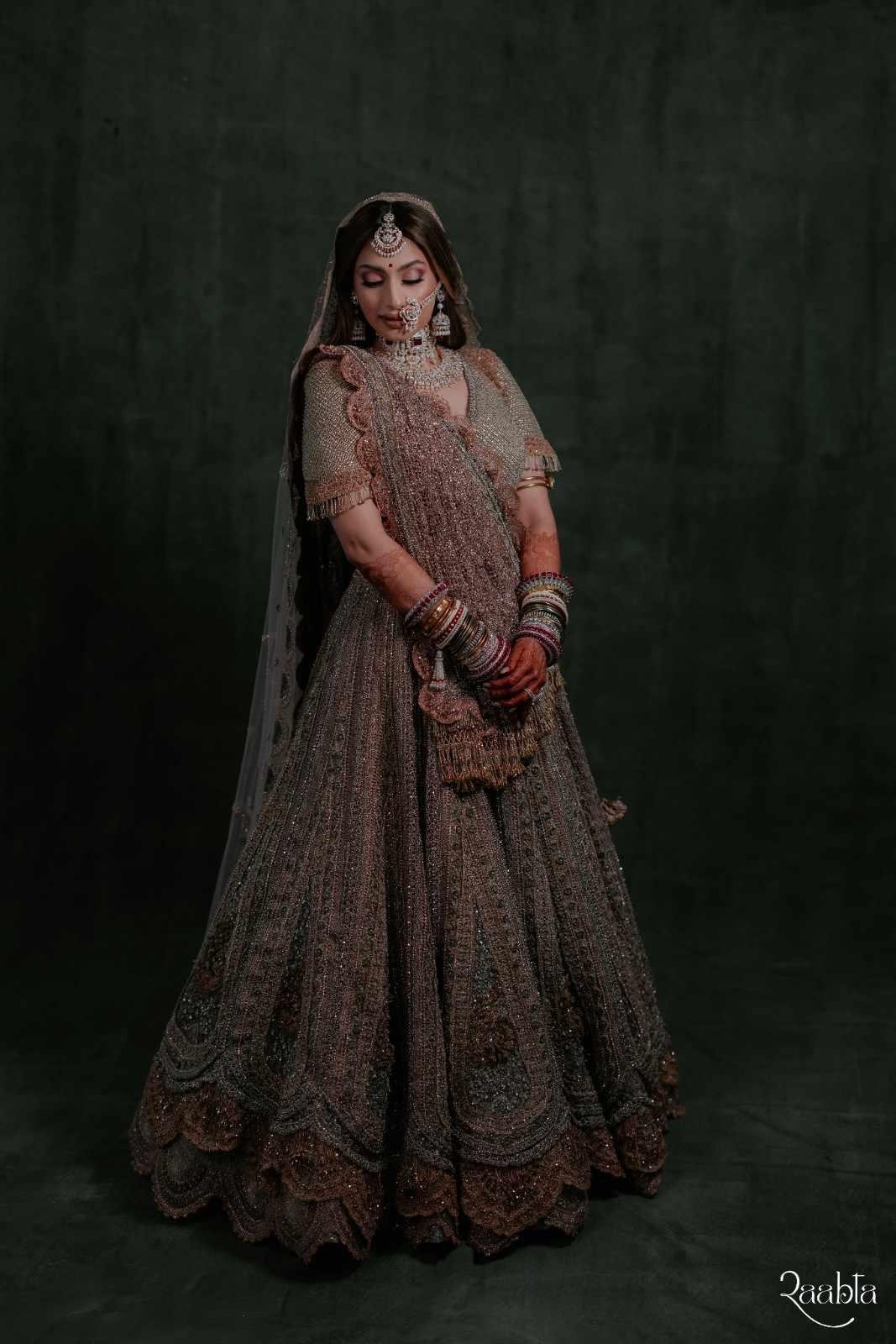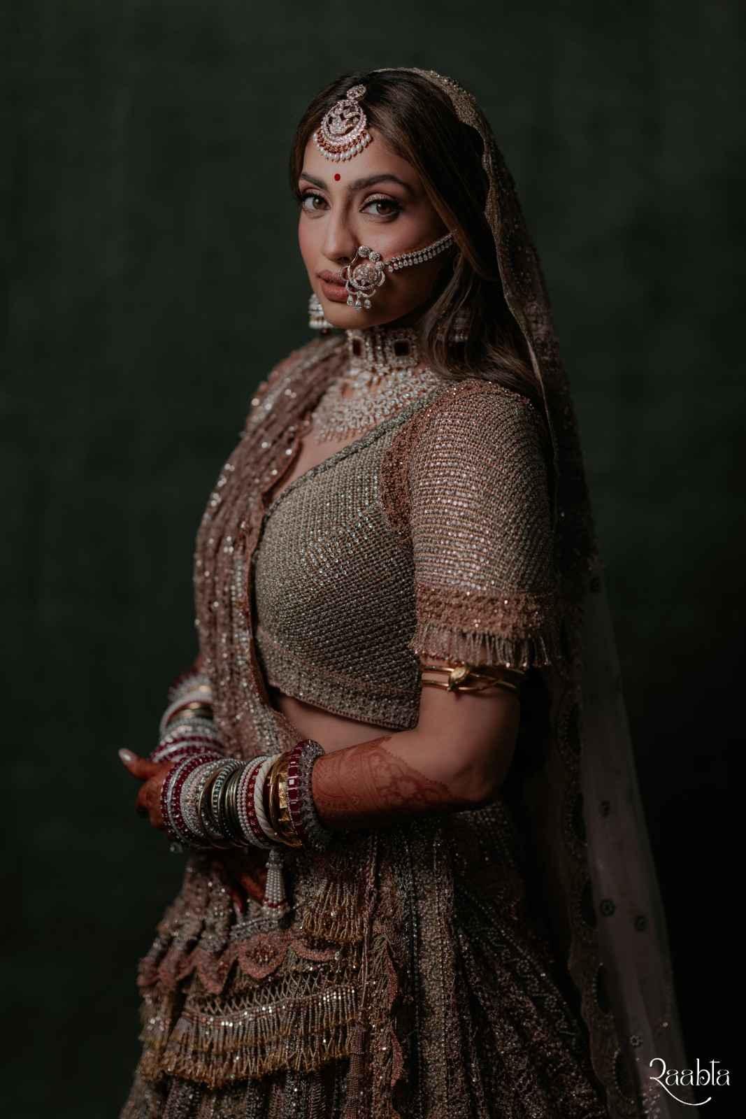 Reviving the historic Mughal-era Kasab technique, Monica approached the lehenga almost like architecture. Rose gold, gold and antique gold threads were layered and interwoven so precisely that they created their own structure, eliminating the need for cloth altogether. As Shweana moved, the lehenga caught the light in the most mesmerising way—fluid yet strong, delicate yet powerful. It had the presence of heirloom jewellery, but with the grace and movement of couture.