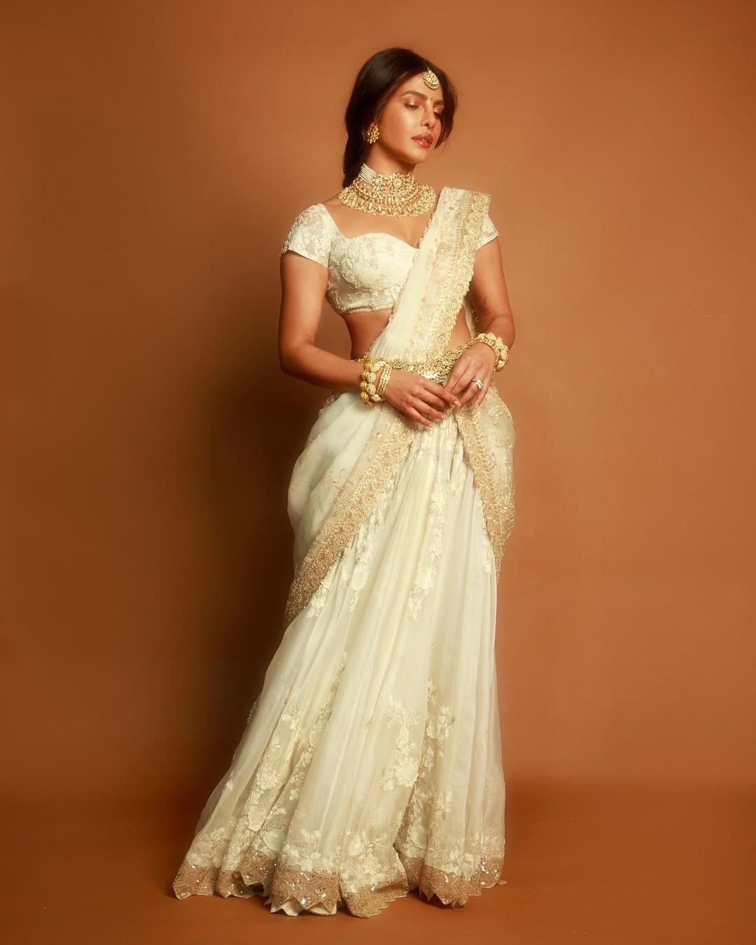For the esteemed event held in Hyderabad, Priyanka Chopra invoked the energies of all apsaras put together to arrive in all finery, custom-designed by Anamika Khanna. The silhouette was unmistakably Anamika Khanna; fluid yet structured, traditionally innovative. The pristine white palette lent an ethereal charm, with her quintessentially signature craftsmanship taking centre stage. Imagine intricate tonal patterns across the lehenga, with delicate layering blended into sculptural form, resulting in couture-like sophistication perfectly suited for a global star. The draped dupatta added to the effortless elegance of the overall ensemble.