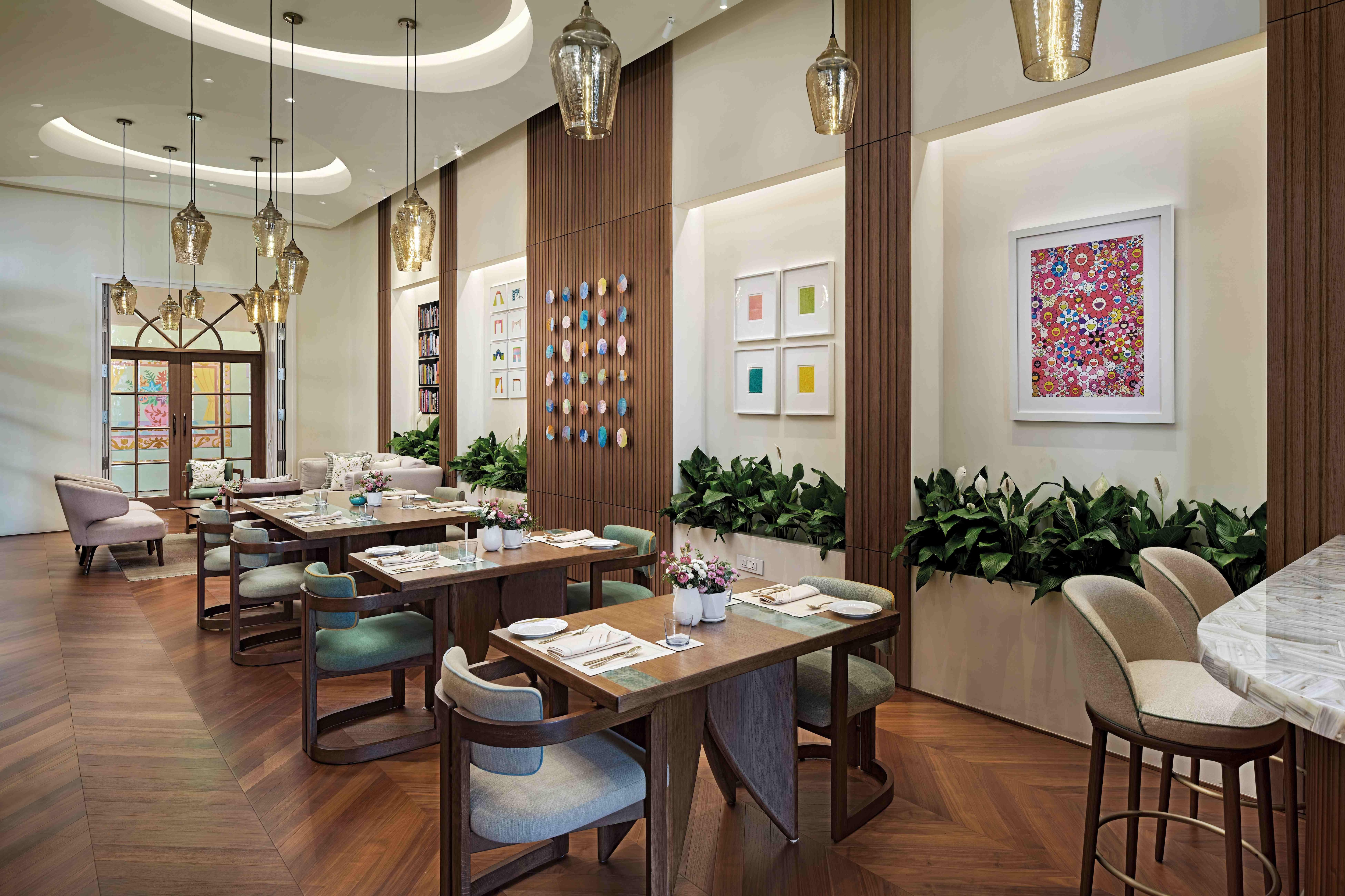 Dining at the Nita Mukesh Ambani Cultural Centre’s Arts Café is an all-consuming sensorial experience. It might be one of the only spaces in India where you can sip a negroni while marvelling at Damien Hirst’s ‘Cherry Blossom’ series of works. In a sophisticated palette of earthy tones, interior designer Gauri Khan created a seamless blend of refined elegance and a raw, natural aesthetic. The magic, however, lies in the almost orchestrated distribution of artworks amid the ornate brassand-gold patterns and luxe lighting fixtures. Other stunning works by celebrated artists like Dia Mehhta Bhupal, Sameer Kulavoor, Jennifer Guidi, Takashi Murakami, Rana Begum and NorBlack NorWhite make the dining experience akin to an art gallery tour