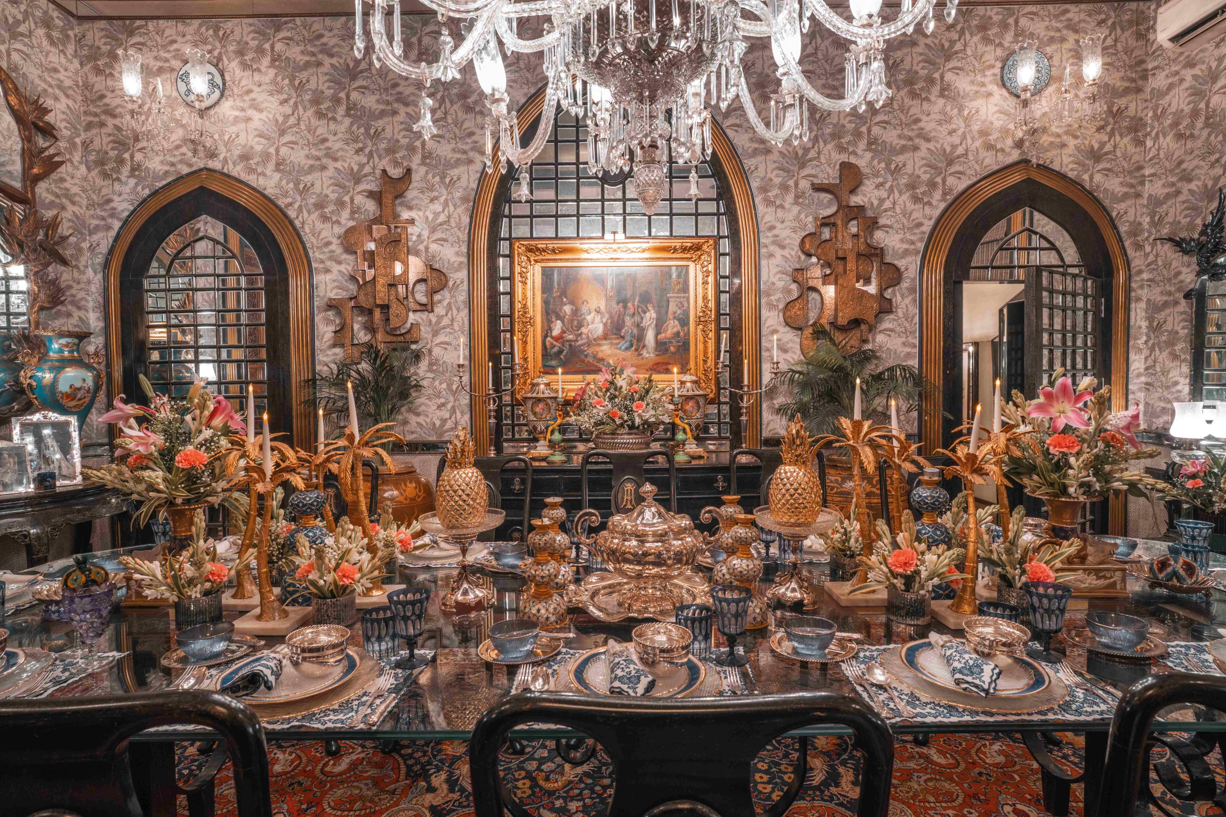 In the dining room, guests eat sitdown, settled on Queen Anne chairs, with napkins matching the perfect blue of the monogrammed crockery made of well-preserved Wedgwood and gleaming silver. Ethereal candelabras shaped like palms by Michael Aram sway high up above bowls of rosebuds, orange lilies, amaryllis, and poinsettias. When asked about his favourite designers, Adil names a few — like Alberto Pinto, the Moroccan interior designer known for drawing upon NeoClassicism and Orientalism. Alberto called entertaining a form of art. He should have popped into Lucknow.