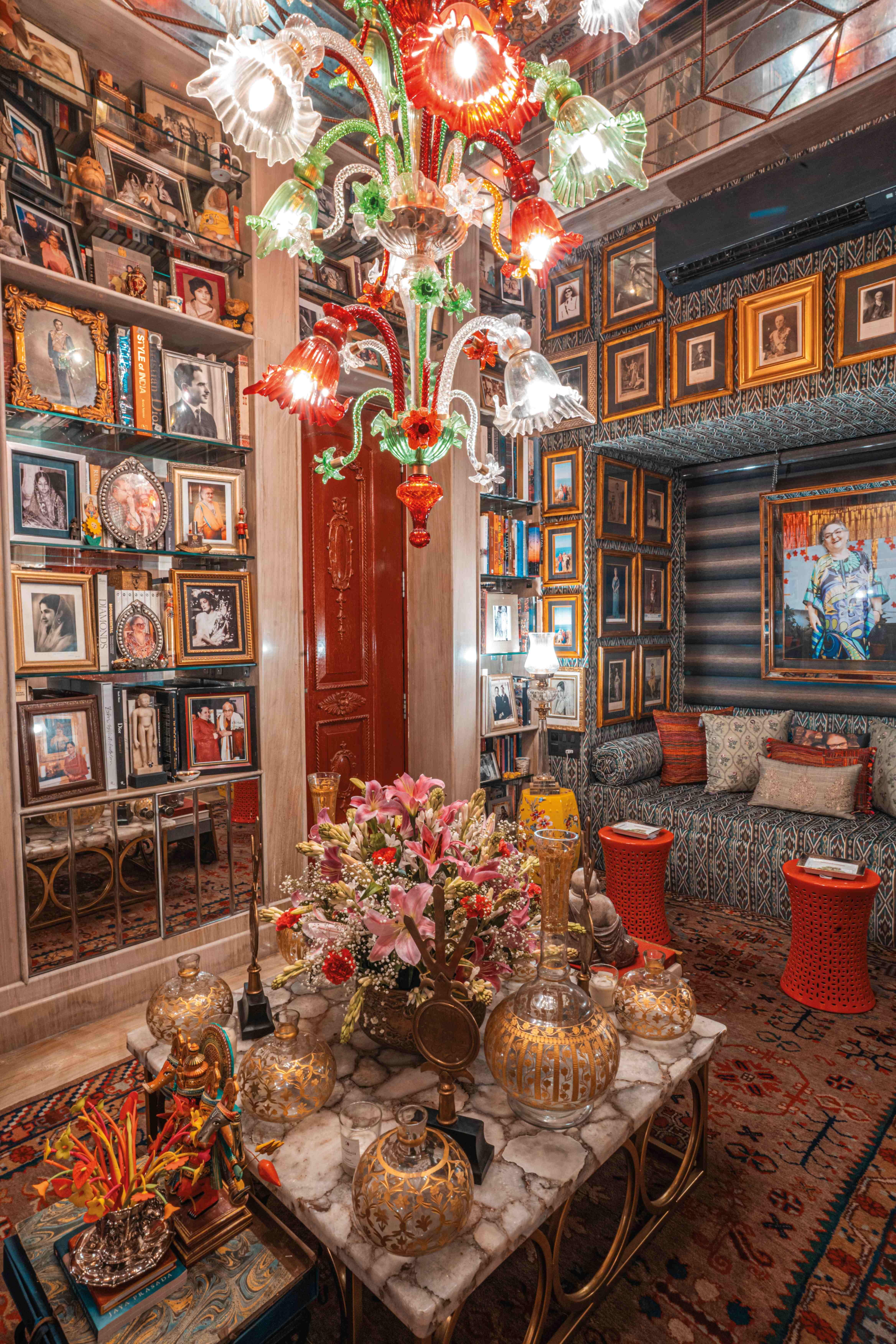 Just one look at the library, for example, is a revelation. To make the room pop even more than it already is, a pair of bright scarlet Chinese garden stools function as tables. The coffee table is a wonder of onyx fused into Perspex, lending it some kind of voodoo as it rests on highly polished hoops of burnished copper. The room has handblown glasses in the Mughal tradition — fine, filigreed, funnelled and flecked with gold — antique brass talismans line up on the table, a deliciously layered Murano-inspired chandelier twinkles and winks overhead. On a table is a charming hand-painted Hanumanji from a street artist in Banaras, along with framed photographs of family grandees, including one rather low-key one of Adil with the Dalai Lama.