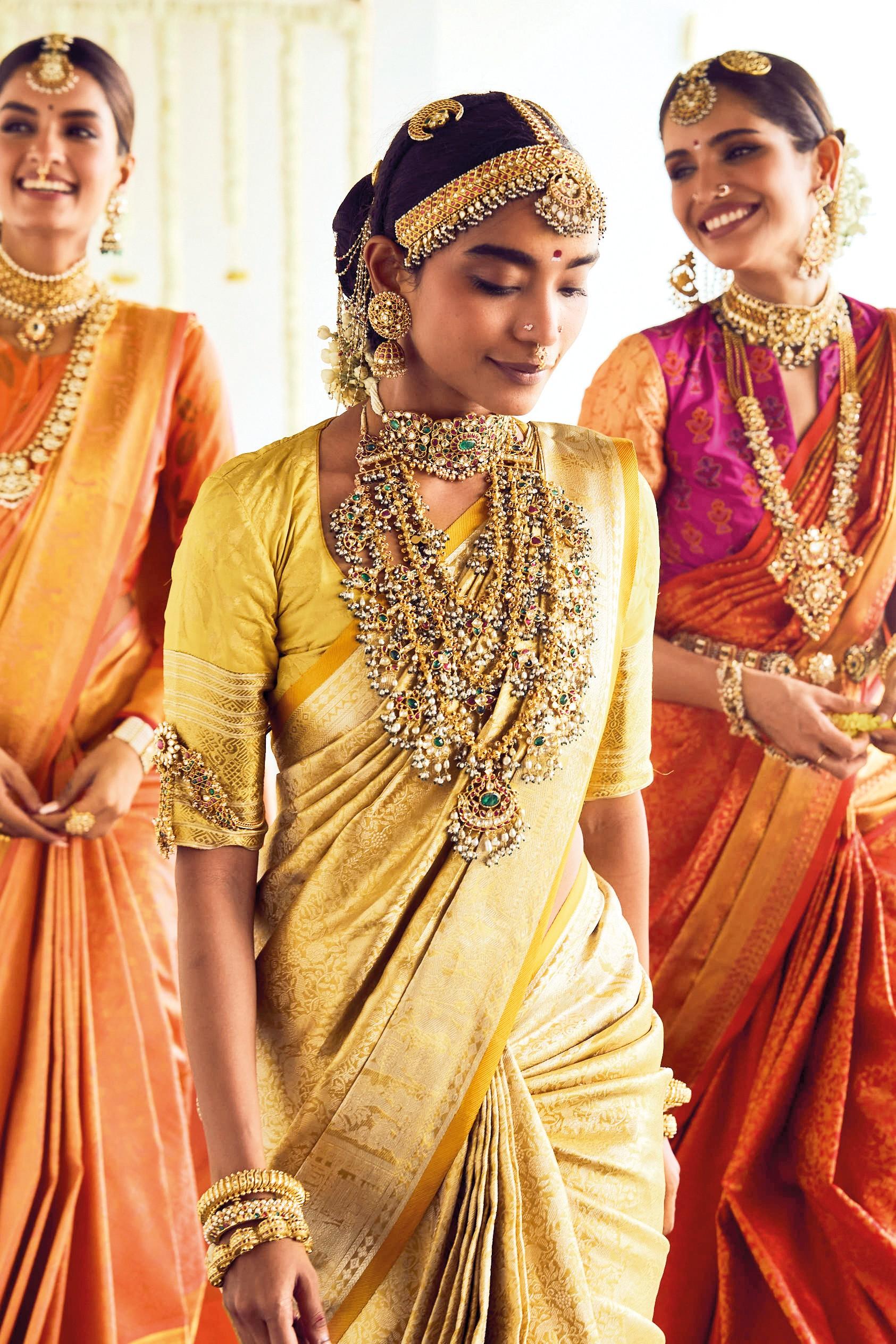 A bridge between divine faith and artistic legacy, temple jewellery finds its origin with the Chola and Pandya dynasties, its earliest avatars offered to the divine. Think gold cast into bells, lotus motifs, peacocks, and celestial figures encrusted with rubies, emeralds, and uncut diamonds. Over the years, these creations made their way to the royal courts, especially into bridal trousseaux and adorned by classical dancers. Made primarily from 22-karat gold, temple jewellery carries inherent architectural depth in its designs. Among the most notable designs till date is the Lakshmi Kasu Haram is the most iconic creation of the Kasulaperu, a necklace strung with gold coins embossed with the goddess of wealth.