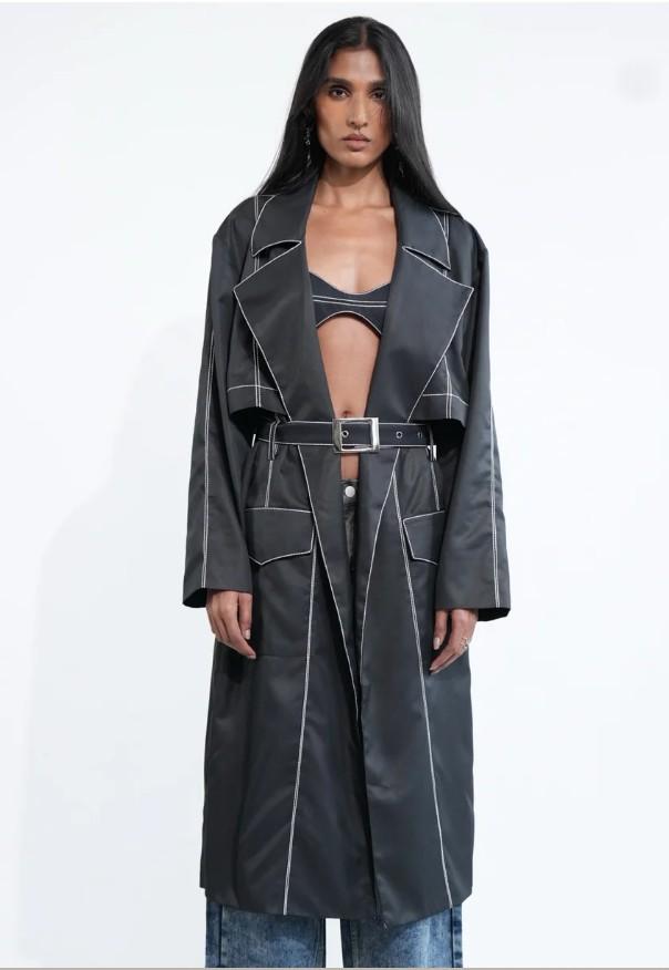 This isn't your grandma's coat. The Erryn Trenchcoat by Label JENN takes the classic silhouette and gives it a major attitude adjustment with a dramatic, wide collar, cinched belt, and fierce contrast white stitching. Throw this over anything for an instant high-fashion, high-drama look that owns the street.