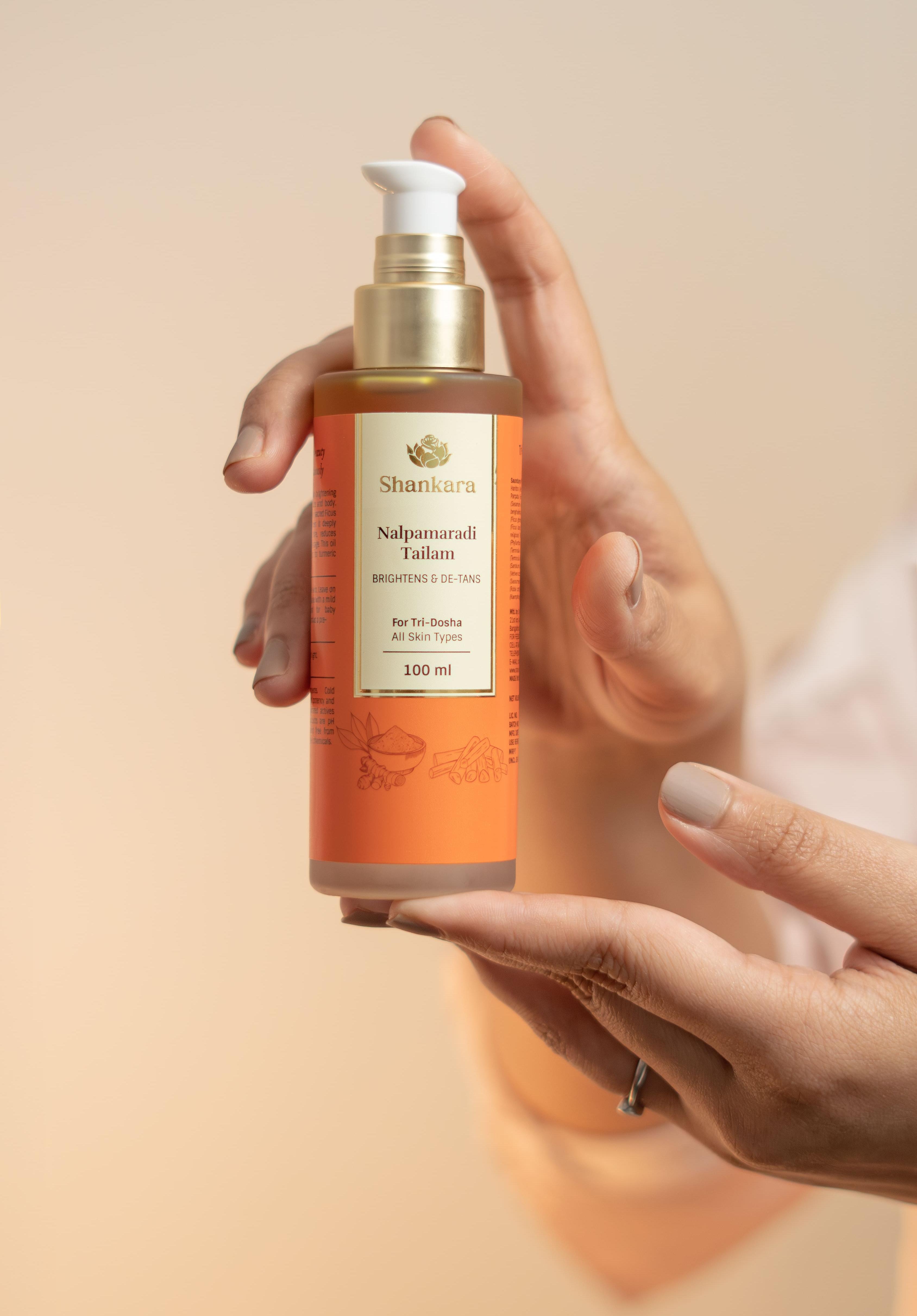 When cooler winds dull the skin, Shankara’s Nalpamaradi Tailam revives it with time-honoured Ayurvedic-inspired care. Brimming with turmeric, sesame, and sacred Ficus extracts, this golden elixir restores radiance and combats post-summer tan, leaving skin supple and luminous through autumn’s dry days.