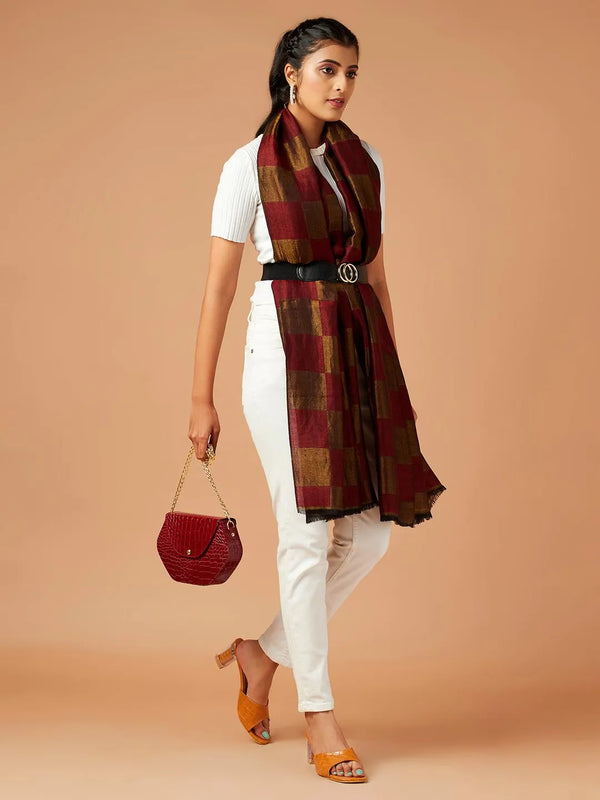 A luxurious deep maroon cashmere stole from Ahujasons, accented with a radiant gold sheen for effortless festive elegance, shouldn't be skipped on your holiday outing.