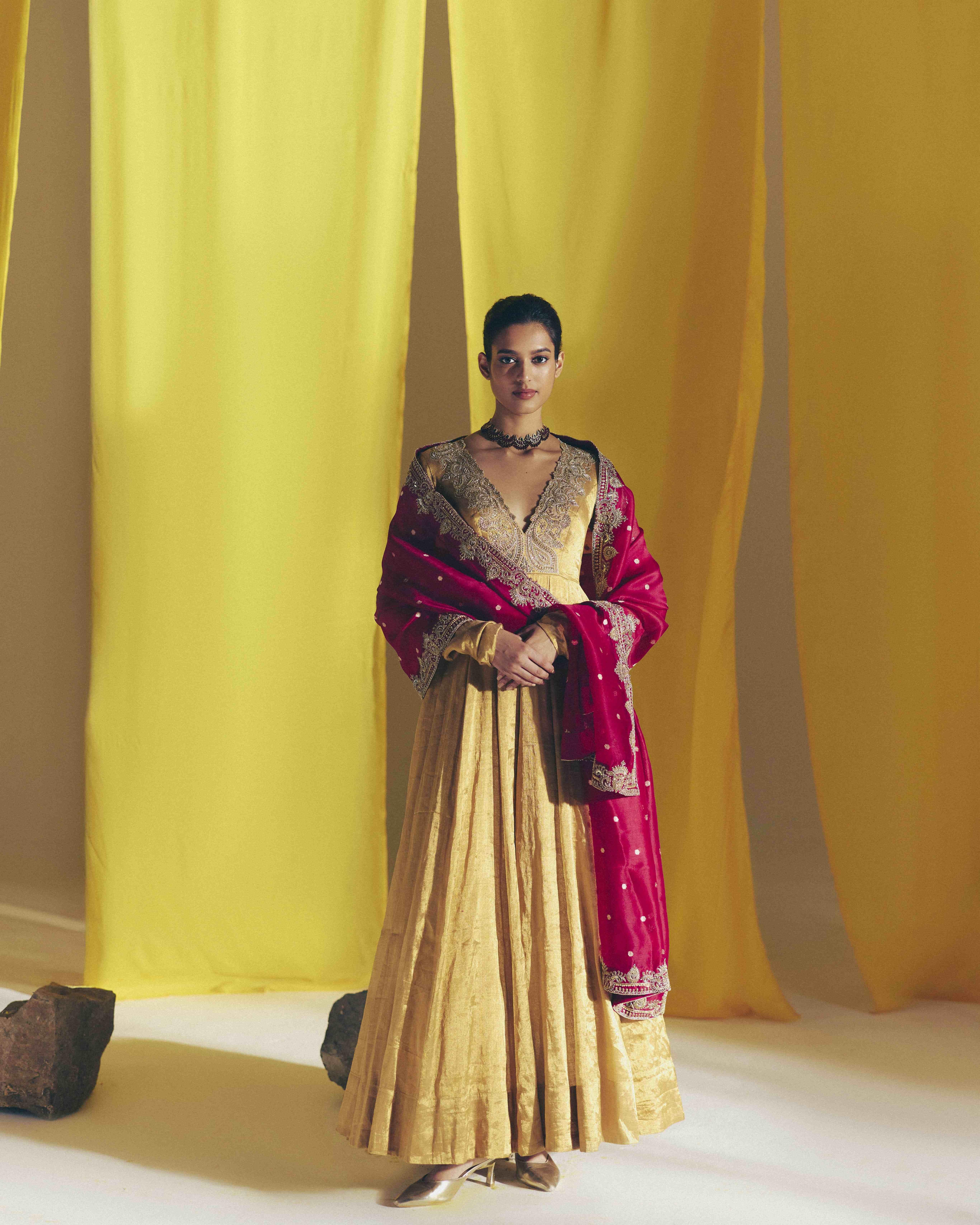 This exquisite ensemble anarkali showcases Mrunalini Rao's signature style of intricate, handcrafted embroidery and dramatic silhouettes. The luxurious fabric and detailed work make it a standout piece, perfect for grand festive occasions and weddings.