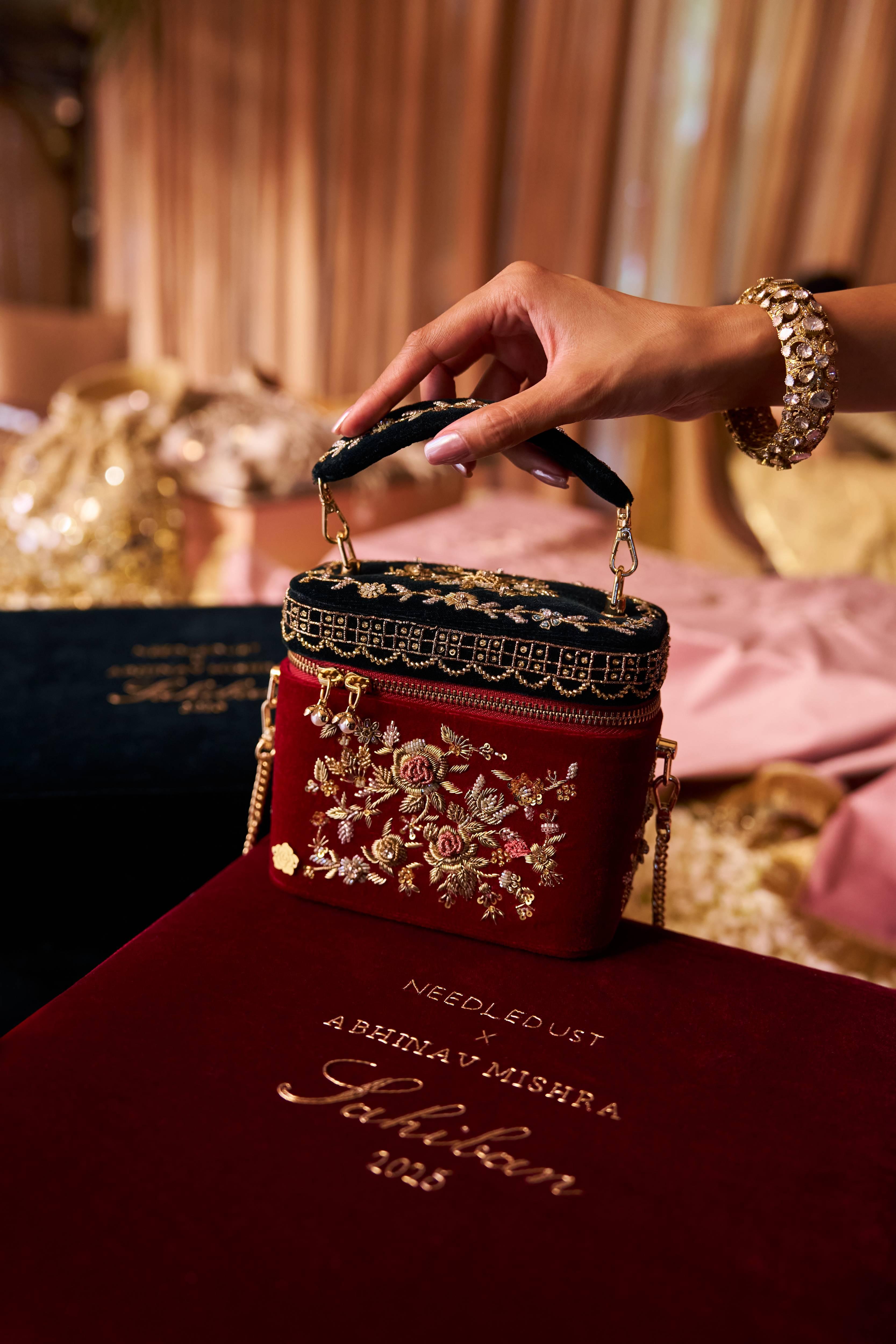 A collaboration that marries comfort with high fashion, this handcrafted handbag from NEEDLEDUST and Abhinav Mishra's third instalment features intricate mirror work and delicate embroidery. They are the ideal accessory choice for the festive season, adding a touch of sparkle to any outfit.