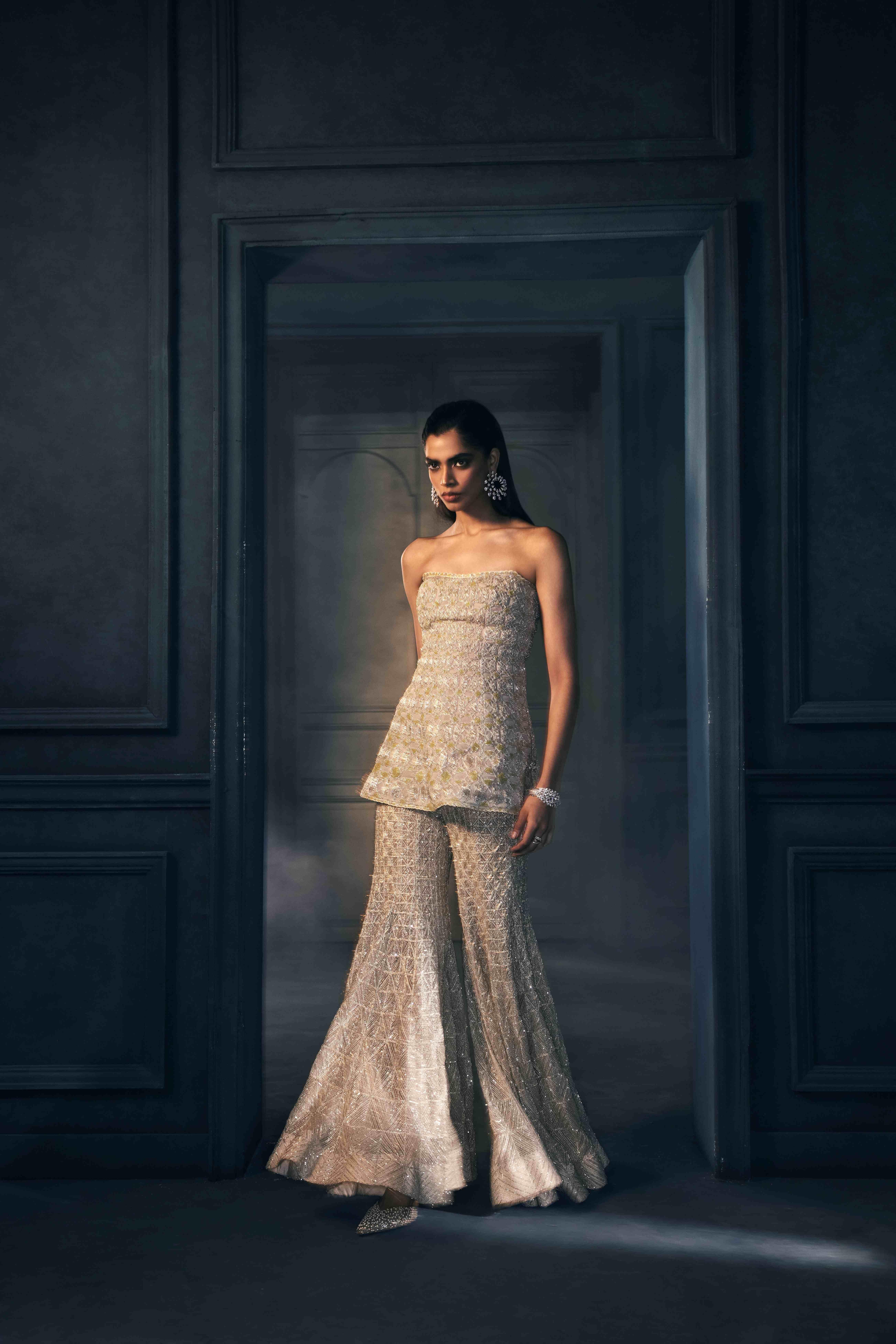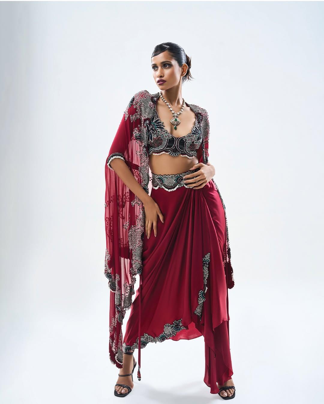 This contemporary outfit by Nupur Kanoi redefines festive wear with its modern silhouette and fluid drape. It offers a chic and hassle-free alternative to traditional attire, allowing you to move with ease while making a stylish statement at any festive gathering.