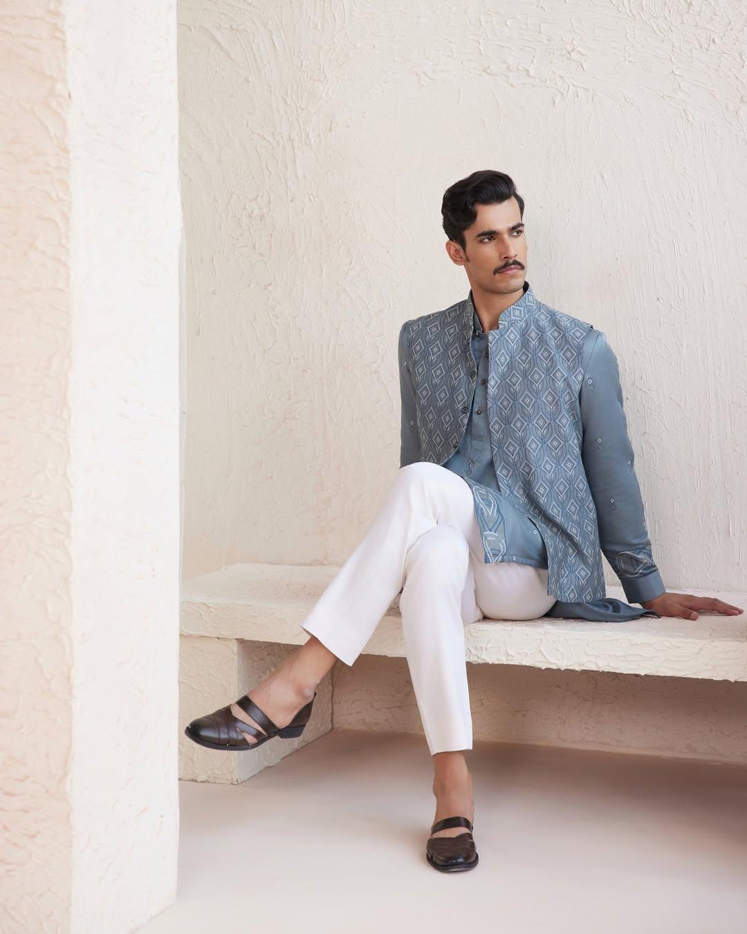 This stylish ensemble for men from Joran features a contemporary Nehru jacket with subtle patterns, paired with a matching kurta and tailored trousers. It's a perfect blend of traditional Indian wear with a modern twist, making it suitable for any festive celebration where comfort meets class.