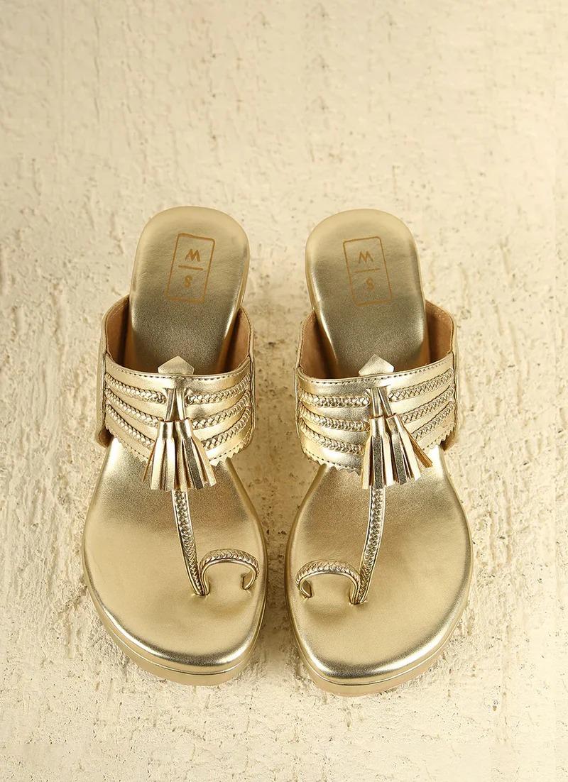 A wedge heel and a blend with the iconic kolhpuri chappals? This wedge sandal is your one-stop solution. This gold pick from Sandalwali is made from 100% vegan leather, which can be styled any way you like and is a festive staple for anything between pujas to parties to wedding night dancing, thanks to the additional cushioning and anti-slip sole for utmost comfort.