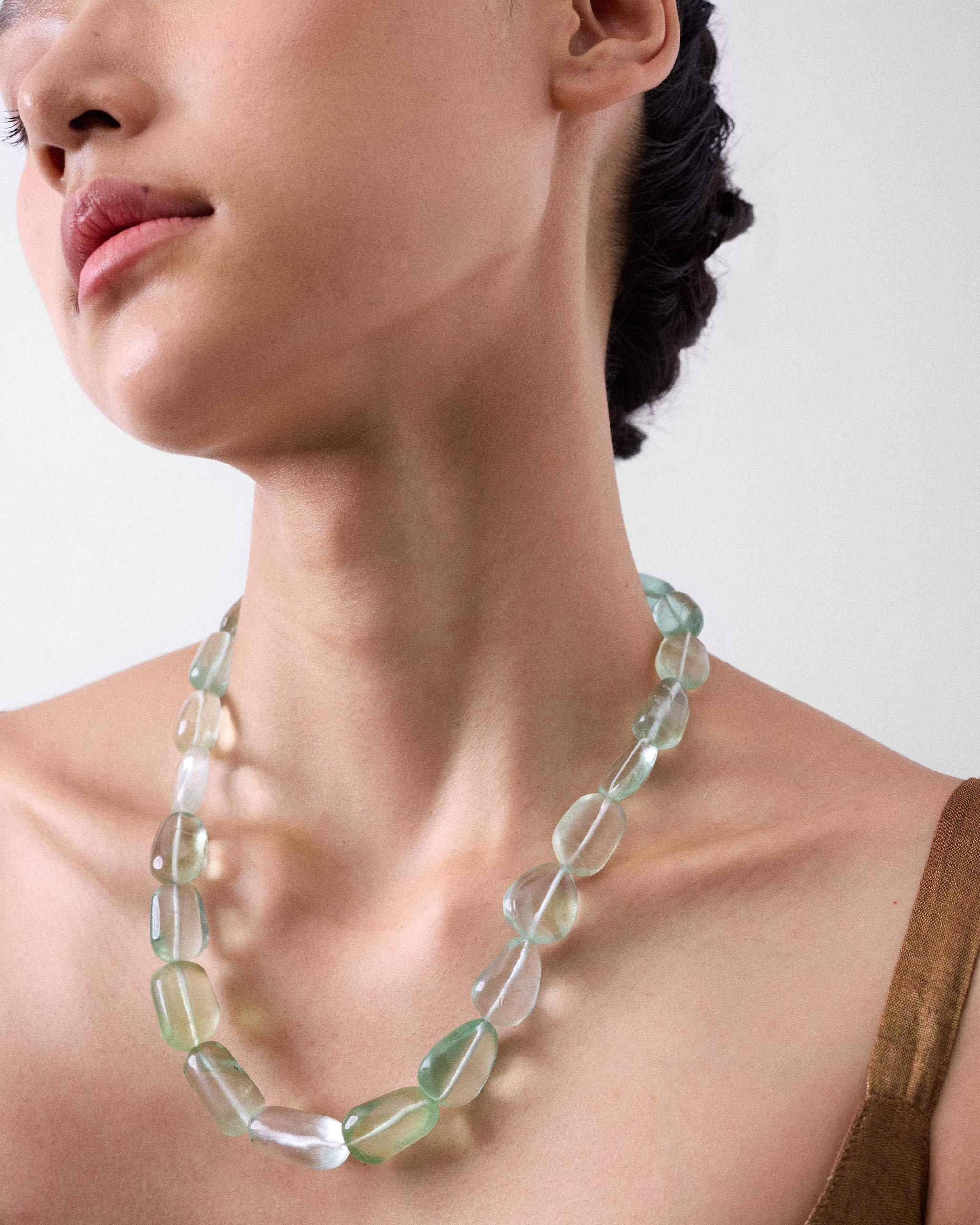 As a gift to yourself or for a loved one, the delicate paan motifs are thoughtfully interspersed among soothing fluorite beads and crafted in brass and finished in a radiant gold plating in this necklace. For festive occasions or a casual getaway, all monsoon OOTDs are incomplete without this delicately crafted necklace.