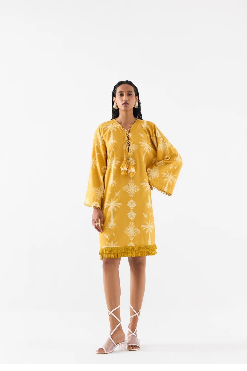 The Cabana Bell Sleeves Dress is made using 100% cotton slub in a tropical palm print, with a v-neckline and bell sleeves; everything to brighten a gloomy monsoon day. Featuring an a-line look, it has strings in the front with shell tassels. With pockets on the side, this piece has a relaxed look and can be styled in different ways, whether with heels or tie-up sandals
