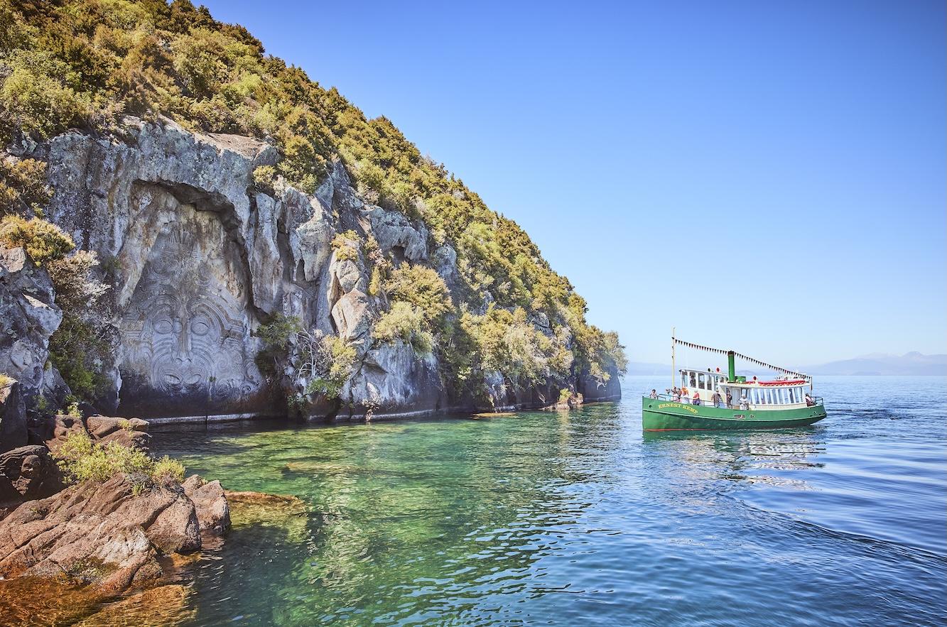 There’s a quiet intimacy in drifting across the volcanic-blue waters of Lake Taupō toward the towering Māori rock carvings that honour ancient Māori myths and legends. Only accessible by water, the world-famous Māori Rock Carvings tower is as high as 14-metres. Board an early-evening cruise, which depart from Taupō Boat Harbour daily, glides across glass-calm water, and toast New Zealand wine as the cliff carvings of rich Māori ancestry appear. This experience invites couples to slow down, listen, and while stirring up a quiet awe that is as reflective as it is romantic.