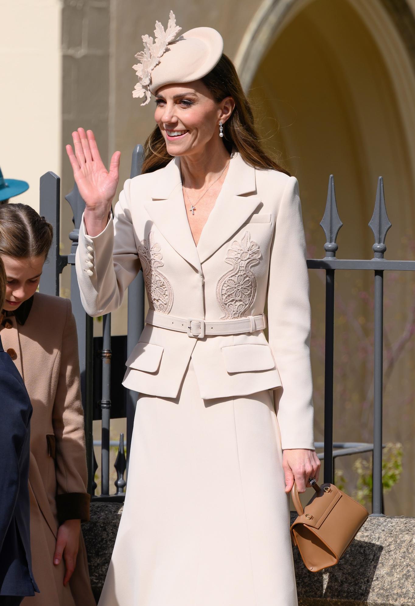 The Princess of Wales, Catherine Middleton, stepped out for the 2026 Easter Matins Service at St George’s Chapel in England with the rest of family, looking sophisticated for the high holiday. Kate chose a refined ensemble in demure ivory tones to attend Easter mass with her husband and children. Her button-down long-sleeved blouse; which featured floral self-designed appliqué work, a belt and pocket flaps, was paired with an A-line flared skirt. The skirt suit set was designed by British fashion brand Self-Portrait and was paired with tan almond-toed pumps by Ralph Lauren and a matching purse by London designer DeMellier. The princess wore a matching toned hat with leaf appliqué which was designed by London-based milliner Juliette Botterill. Jewellery is where her personal style shone the brightest. In line with Easter service, Kate accessorised with a cross pendant on a dainty necklace. She paired it with heirloom pearl drop earrings which were a wedding gift to Queen Elizabeth II given to her by the Hakim of Bahrain in 1947. The neutral-toned ensemble was a departure from a blue palette, which Kate has chosen for years now on Easter Sunday.